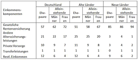 Die GRV ist in Deutschland das bedeutendste Alterssicherungssystem, wie beispielsweise die repräsentative Erhebung „Alterssicherung in Deutschland“ (ASID) aus dem Jahr 2011 zeigt: insgesamt 90 Prozent aller Personen ab 65 Jahren bezogen eine eigene Rente aus der GRV. In Westdeutschland lag der Anteil bei 88 Prozent, in Ostdeutschland bei 99 Prozent. Der Beitrag der GRV zum Einkommen ist ebenfalls groß: Ihr Anteil am Bruttodurchschnittseinkommen Älterer beträgt 64 Prozent. Andere Alterssicherungssysteme kommen auf einen Anteil von 21 Prozent, und weitere Einkommensquellen, wie Transfers oder Einkünfte aus Erwerbstätigkeit, machen rund 16 Prozent aus (Bundesregierung 2012, S.15f). Tabelle 1 zeigt, dass auch hier die Bedeutung der GRV in Ostdeutschland höher ist als im Westen. Häufig wird außerdem der Einkommensvorteil („Mietwert“) einer selbstgenutzten Immobilie berücksichtigt. Ältere besitzen häufiger als der Rest der Bevölkerung hypothekenfreie Immobilien. Goebel und Grabka (2011) schätzen, dass sich der Mietwert auf sechs bis zehn Prozent des Haushaltsbruttoeinkommens aller Rentnerhaushalte beläuft.