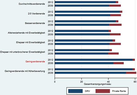 Außer für Alleinerziehende sinkt das Niveau der GRV zwischen 2012 und 2030. Für Geringverdienende (definiert als 45 Jahre Erwerbsarbeit mit 50 Prozent des Durchschnittsverdienstes) ist der Rückgang besonders stark, da die „Rente nach Mindestentgeltpunkten“ ausläuft und im Rentenzugangsjahr 2030 kaum noch Anwendung findet. Würde die Regelung weitergeführt, so fiele die Niveausenkung deutlich moderater aus (vgl. die Kategorie „Geringverdienende mit Höherbewertung“).