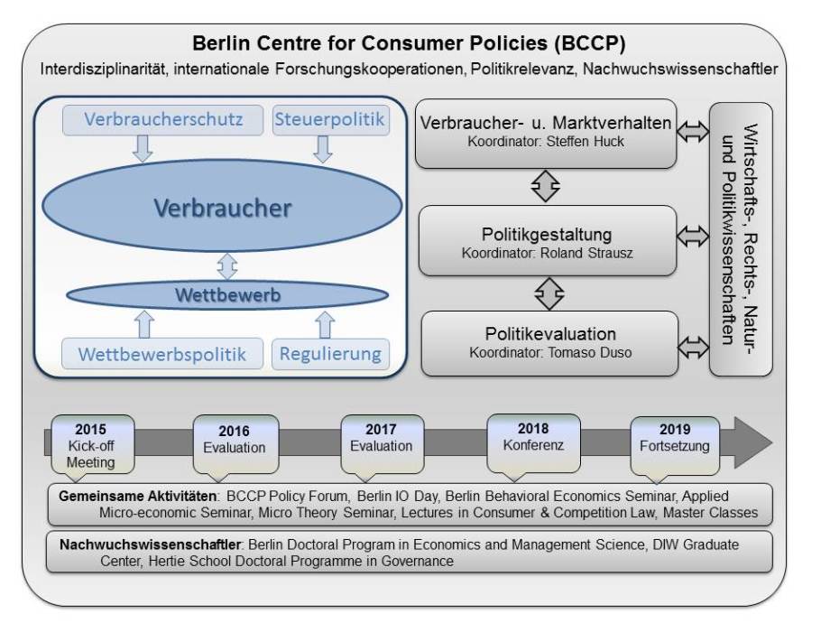 Die Förderung von Verbraucherrechten, Prosperität und Wohlstand sind Grundwerte der Europäischen Union. Eine ganze Bandbreite von Gesetzen, Institutionen und Regulierungen – die unter dem Begriff Verbraucherpolitiken zusammengefasst werden können – haben das Ziel Konsumenten zu schützen, indem sie sicherstellen, dass angemessene und vertrauensvolle Informationen auf dem Markt zur Verfügung stehen und sie Unternehmen an unfairen und wettbewerbsschädlichen Praktiken hindern. Während einige dieser wirtschaftspolitischen Maßnahmen Konsumenten unmittelbar betreffen, beispielsweise der Verbraucherschutz und eine abschreckende Besteuerung, nützen andere den Konsumenten indirekt indem sie Marktprozesse durch Regulierung und Wettbewerbspolitik steuern. Die Interaktionen zwischen den verschiedenen Maßnahmen werden derzeit noch nicht gänzlich verstanden. Das Ziel des Berlin Centre for Consumer Policies ist es, eine dauerhafte internationale Plattform für Wettbewerb und Verbraucherpolitik im weitesten Sinn zu schaffen, in welcher exzellente interdisziplinäre Forschung die Politik aktiv und effektiv zu Themen beraten kann, die hoch relevant in der derzeitigen politischen Diskussion sind.