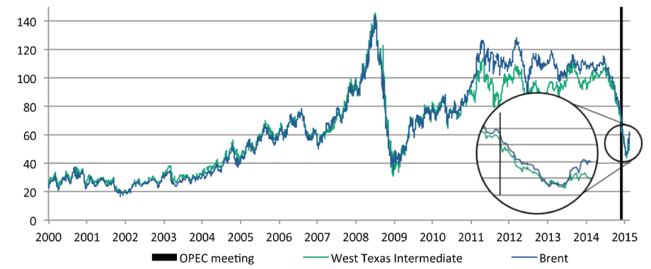 Figure 1: Daily crude oil price, West Texas Intermediate (WTI) and Brent, in nominal USD/bbl; the OPEC meeting on Nov 27, 2014, is marked for illustration (source: EIA,accessed February 26, 2015)
