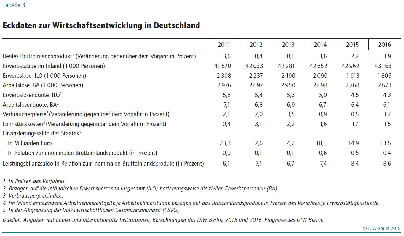 DIW-Konjunkturexperten prognostizieren für 2015 ein Wachstum von 2,2 Prozent, 2016 soll es bei 1,9 Prozent liegen – Kapazitäten wieder nahezu ausgelastet – Ausländische Absatzmärkte weniger wichtig als vor der Krise – Wachstumstreiber ist der private Konsum, gestützt auf guten Arbeitsmarkt – Überschüsse in den öffentlichen Haushalten weiterhin hoch – Die internationalen Risiken bleiben erheblich