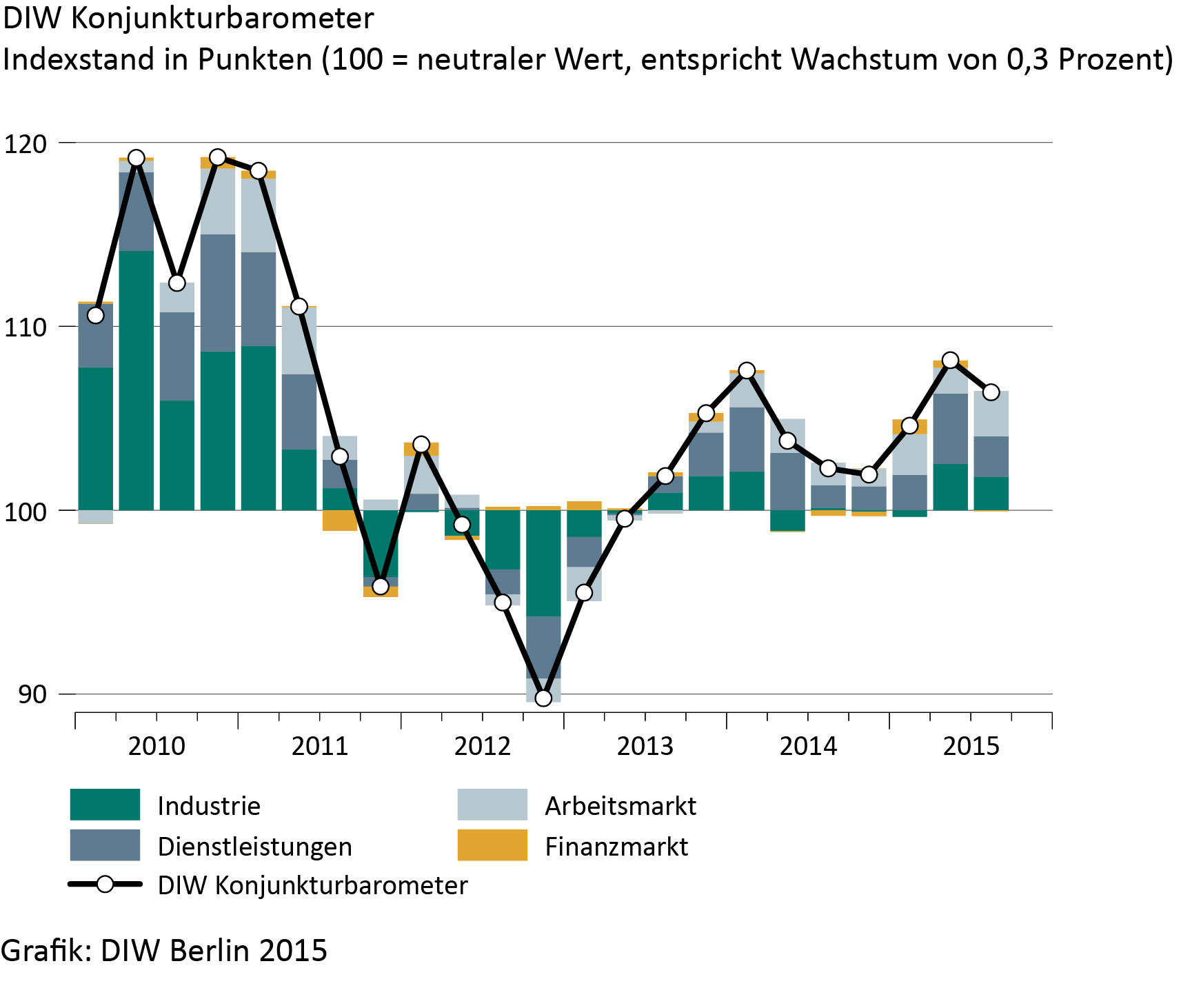 „Vor allem der Arbeitsmarkt ist zur Zeit eine große Stütze für die Konjunktur“, sagt DIW-Konjunkturchef Ferdinand Fichtner. „Die Beschäftigungssituation hat sich zuletzt dynamisch entwickelt und stützt den privaten Verbrauch“, so Fichtner weiter. Die privaten Haushalte profitieren nach Einschätzung des DIW Berlin zudem von den sinkenden Importpreisen. Allerdings verliere der kaufkraftsteigernde Effekt des Rückgangs der Ölpreise allmählich an Einfluss, so dass die Zuwächse beim Konsum wohl nicht mehr ganz so kräftig ausfallen werden wie in der ersten Jahreshälfte. Entsprechend dürften die konsumnahen Dienstleistungen weiter zulegen, aber etwas an Schwung verlieren.