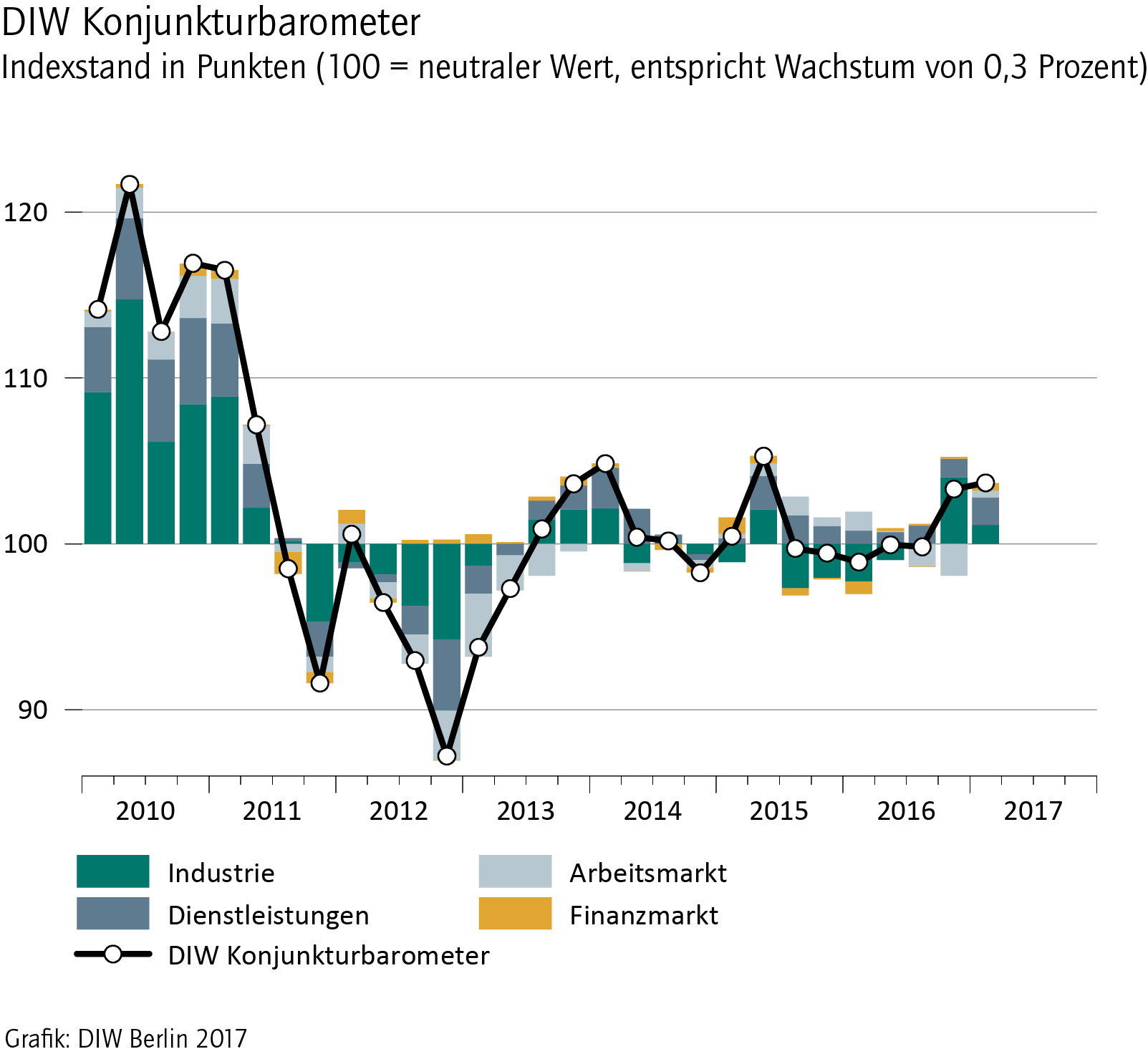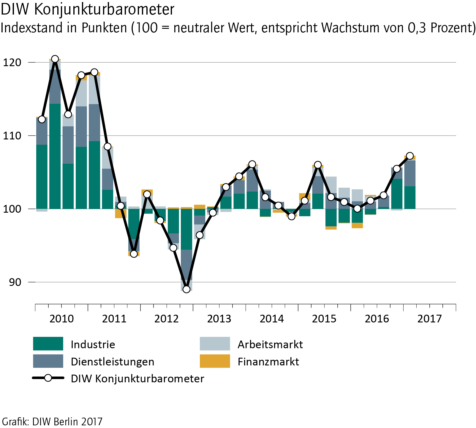 Das Konjunkturbarometer des Deutschen Instituts für Wirtschaftsforschung (DIW Berlin) klettert für das erste Quartal auf 107 Punkte und signalisiert damit für den Jahresbeginn 2017 ein überdurchschnittliches Plus beim Bruttoinlandsprodukt; der Zuwachs dürfte im ersten Quartal bei knapp 0,6 Prozent liegen, etwas höher noch als im Schlussquartal 2016.