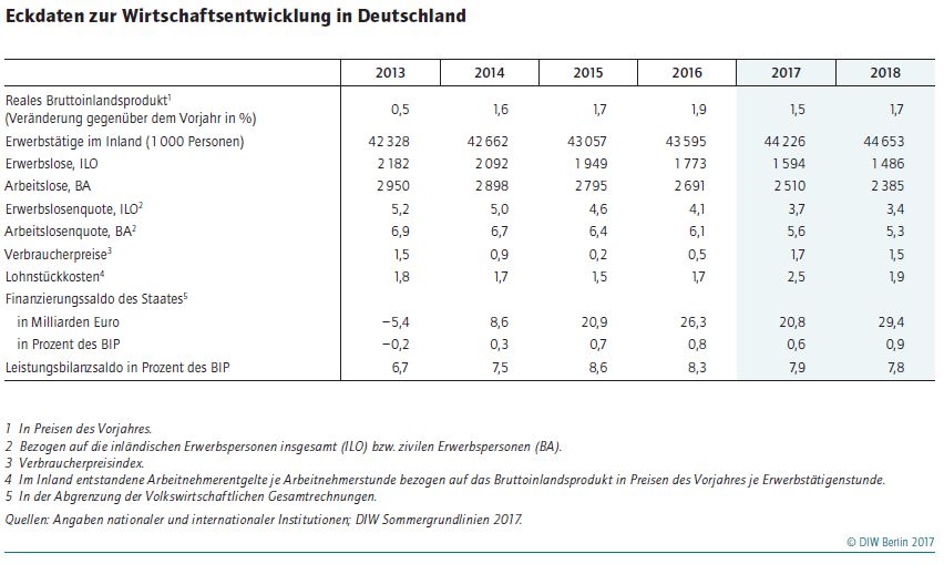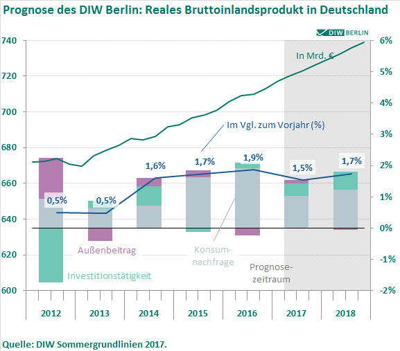 DIW Berlin prognostiziert 1,5 Prozent Wachstum für dieses und 1,7 Prozent für kommendes Jahr – Stetiges Wachstum im vierten Jahr in Folge – Anzeichen für eine Überhitzung gibt es nicht – Euroraum erholt sich weiter – Globaler Aufschwung trotz Risiken