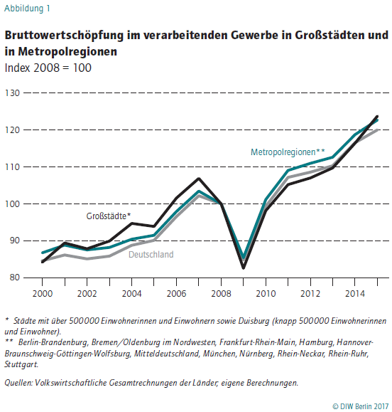 Die Industrieproduktion ist in den 15 größten deutschen Städten seit 2008 um 24 Prozent gestiegen – und damit stärker als in Deutschland insgesamt, wo es ein Plus von 20 Prozent gab. Das geht aus einer aktuellen Studie des Deutschen Instituts für Wirtschaftsforschung (DIW Berlin) hervor, für die Alexander Eickelpasch, wissenschaftlicher Mitarbeiter der Abteilung Unternehmen und Märkte, die Entwicklung der Industrie in Großstädten mit der in Metropolregionen und dem gesamten Bundesgebiet verglichen hat. „Von einer Erosion der Industrie in Großstädten kann keine Rede sein, denn auch die großstädtische Industriebeschäftigung hat sich nach der Krise in den Jahren 2008 und 2009 deutlich erholt“, so Eickelpasch. „Klein, aber fein ist eher eine passende Zuschreibung: Die Industrie macht in Großstädten zwar nur 15 Prozent der gesamten Wertschöpfung aus, ist dafür aber hoch produktiv, auf Wachstumskurs und deshalb sehr bedeutend für die wirtschaftliche Entwicklung der Städte.“