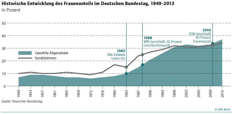 Im aktuellen Bundestag sind 37 Prozent der Abgeordneten Frauen. Deutschland steht somit im internationalen Vergleich auf Platz 24. Saßen im Bundestag im Jahr 1949 nur sieben Prozent weibliche Abgeordnete, so ist dieser Anteil seit den 1980er Jahren stetig gestiegen. „Die Grünen, die von Anfang an auf Parität gesetzt haben und seit 1983 im Parlament vertreten sind, haben bei der Verbesserung der weiblichen Repräsentation eine maßgebliche Rolle gespielt, und die anderen Parteien sind mit Selbstverpflichtungen und Quoten nachgezogen“, so Studienautor Ronny Freier. „Allerdings hat sich der Zuwachs des Frauenanteils in den letzten 20 Jahren verlangsamt."