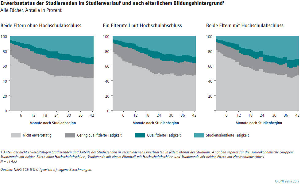 Studierende sind häufig nicht nur deshalb nebenbei erwerbstätig, weil sie sich etwas hinzuverdienen wollen oder müssen. Studienorientierte und qualifizierte Tätigkeiten bieten die Möglichkeit, praktische Erfahrungen zu sammeln und frühzeitig Kontakte zu potentiellen späteren Arbeitgebern zu knüpfen. So kann ein Nebenjob nach dem Studium die Chancen auf dem Arbeitsmarkt verbessern. Umso wichtiger ist die Frage, ob der sozioökonomische Hintergrund der Studierenden, etwa die Bildung ihrer Eltern, eine Rolle für die studentische Erwerbstätigkeit spielt – denn das könnte dazu führen, dass sich soziale Unterschiede während des Studiums aufgrund des Nebenjobs verfestigen. Insbesondere mit Blick auf die Sozial-, Geistes- und Wirtschaftswissenschaften erscheint die Frage, wer welcher Art von Studentenjobs nachgeht, entscheidend. Denn Studierende dieser Disziplinen steuern weniger auf einen konkreten Beruf zu, anders als beispielsweise Jura-, Medizin- oder LehramtsstudentInnen. Die DIW-Studie zeigt allerdings, dass bei den weniger berufsorientierten Studienfächern Studierende mit Akademikereltern keine höhere Wahrscheinlichkeit haben, einem qualifizierten und studienbezogenen Nebenjob nachzugehen.