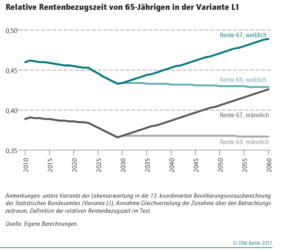 Die aktuelle Erhöhung der Regelaltersgrenze von 65 auf 67 Jahre hat im Jahr 2012 begonnen und wird im Jahr 2031 abgeschlossen sein. Da die Lebenserwartung voraussichtlich auch danach weiter ansteigen wird, könnte eine weitere Erhöhung der Regelaltersgrenze gewährleisten, dass das Verhältnis von Rentnern und Erwerbstätigen konstant bleibt. Die Berechnungen von Buslei auf der Basis einer Bevölkerungsvorausberechnung des Statistischen Bundesamtes zeigen, dass sich die relative Rentenbezugsdauer – also die Dauer des Rentenbezugs in Relation zur Beitragszeit – bei der heute geltenden Rente mit 67 ab dem Jahr 2031 deutlich erhöht. Steigt die Lebenserwartung beispielsweise bis zum Jahr 2060 um geschätzte drei Jahre, müsste man, um die relative Rentenbezugsdauer auf dem Niveau des Jahres 2030 zu halten, im gleichen Zeitraum das Renteneintrittsalter um weitere zwei auf 69 Jahre anheben. Die Grafik verdeutlicht diesen Effekt:
