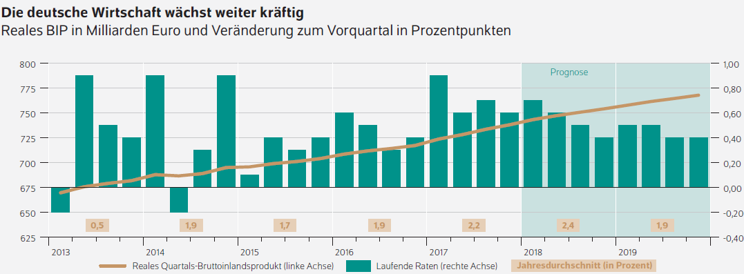 Ohne den zusätzlichen Stimulus aus dem Programm der neuen Bundesregierung würde die Konjunktur im Jahr 2019 abflachen, unter anderem weil die geldpolitische Wende – die Zinsen werden in den USA schrittweise steigen, in Europa perspektivisch auch – das Wachstumstempo der Weltwirtschaft und somit die Auslandsnachfrage leicht dämpfen dürfte.