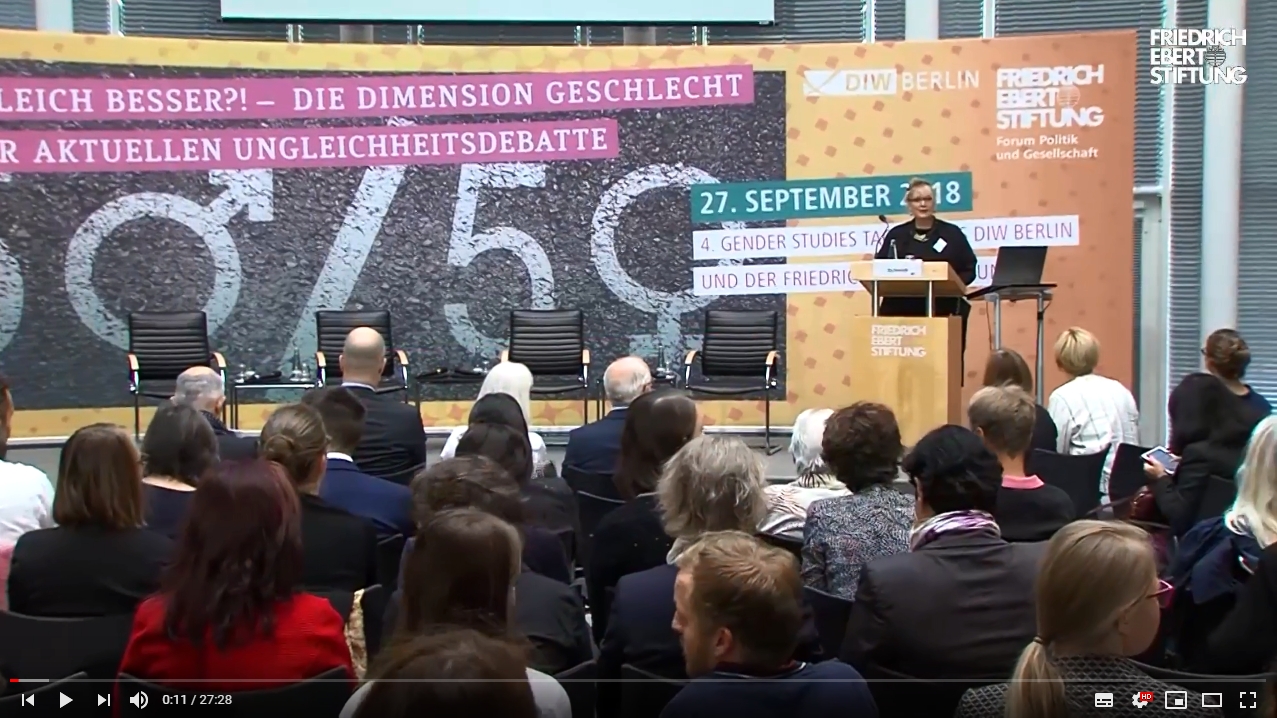 Am 27. September veranstaltete das DIW Berlin in Kooperation mit der Friedrich-Ebert-Stiftung die 4. Gender Studies Tagung zum Thema "(Un)gleich besser?! - Die Dimension Geschlecht in der aktuellen Ungleichheitsdebatte". Auch in diesem Jahr fand die Tagung wieder bei vollem Haus statt. Alle Interessierten, die es nicht in die Räumlichkeiten der FES geschafft hatten, konnten die Konferenz über einen Livestream mitverfolgen und unter dem Hashtag #Gender2018 auf Twitter zur Diskussion beitragen.