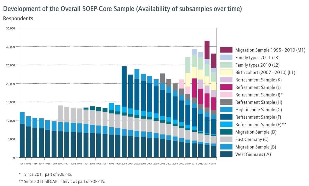 Mit der nun vorliegenden Version 31 ist die FiD-Stichprobe vollständig in die SOEP-Core-Daten integriert worden – und zwar im Prinzip so, als wären 2010 und 2011 jeweils neue Stichproben für SOEP-Core gezogen worden. Die Integration der FiD-Stichproben erhöht damit signifikant die Fallzahlen in SOEP-Core um fast ein Drittel. Die Grafik zeigt den Einfluss der neuen FiD-Stichproben L1 bis L3 auf die querschnittliche Stichprobengröße ab 2010. Aufgrund der rückwirkenden Integration musste auch die sample -Variablen angepasst werden, da ja seit 2010 auch andere Aufwuchsstichproben zu SOEP-Core hinzukamen (zu den Einzelheiten der Stichproben-Bezeichnungen siehe unten).