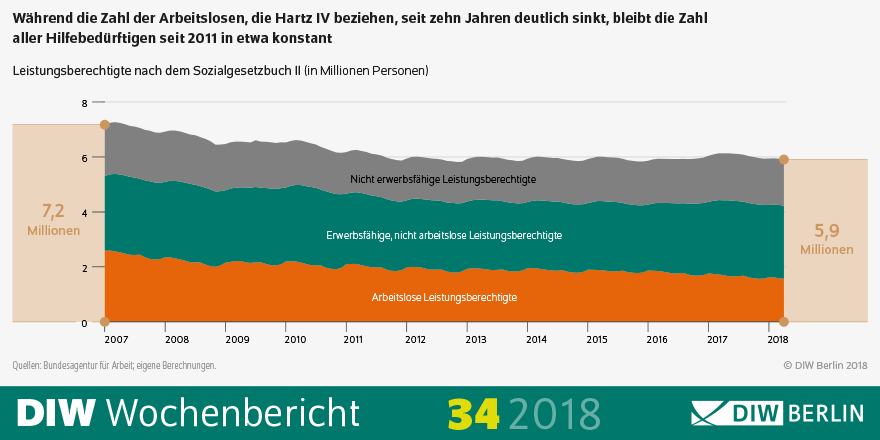 Die Zahl der Bezieherinnen und Bezieher von Hartz-IV-Leistungen ist trotz des Arbeitsmarktbooms seit dem Jahr 2011 nicht weiter zurückgegangen – sie liegt relativ konstant in der Nähe der Sechs-Millionen-Marke. Das geht aus einer Studie des Deutschen Instituts für Wirtschaftsforschung (DIW Berlin) hervor, für die der DIW-Arbeitsmarktforscher Karl Brenke Daten der Bundesagentur für Arbeit ausgewertet hat. Allerdings gab es im vergangenen Jahr deutlich weniger Arbeitslose, die Hartz IV bezogen, als zehn Jahre zuvor. Um rund eine Million Personen – von knapp 2,6 auf fast 1,6 Millionen – sank in diesem Zeitraum die Zahl der erwerbslosen Personen, die Arbeitslosengeld II erhielten. „Obwohl ein großer Teil der arbeitslosen Hartz-IV-Bezieher, inzwischen fast zwei Drittel, keine abgeschlossene Berufsausbildung hat, haben wegen der guten konjunkturellen Lage viele eine Beschäftigung gefunden“, so Brenke. „Es sind in den vergangenen Jahren zahlreiche gering qualifizierte Jobs entstanden, wovon die Hartz-IV-Arbeitslosen profitieren konnten.“