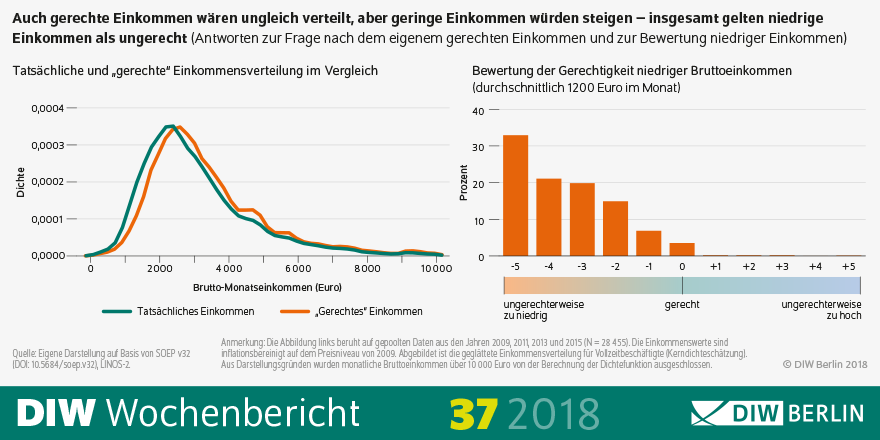 DIW-Studie untersucht auf Umfragebasis, als wie gerecht Erwerbseinkommen in Deutschland wahrgenommen werden – Dass Einkommen ungleich verteilt ist, wird grundsätzlich akzeptiert – Überwältigende Mehrheit der Befragten nimmt aber untere Arbeitseinkommen als zu niedrig wahr – Um Gefühl der Gerechtigkeit in der Bevölkerung zu erhöhen, muss Politik bei niedrigen Löhnen ansetzen.