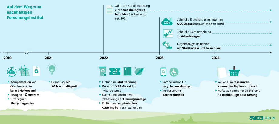 Im Jahr 2021 wurde die Arbeitsgruppe "Nachhaltigkeit" gegründet, bestehend aus mehreren wissenschaftlichen und nichtwissenschaftlichen DIW-Mitarbeitenden unterschiedlicher Verantwortungsgebiete. Ein wesentliches Ziel der AG besteht im Erreichen der CO2-Neutralität für das DIW Berlin. Auf dem Weg zur Umsetzung soll bewusstes, nachhaltiges und effizientes Handeln in allen Bereichen des Hauses gefördert werden.