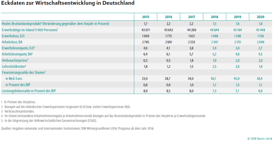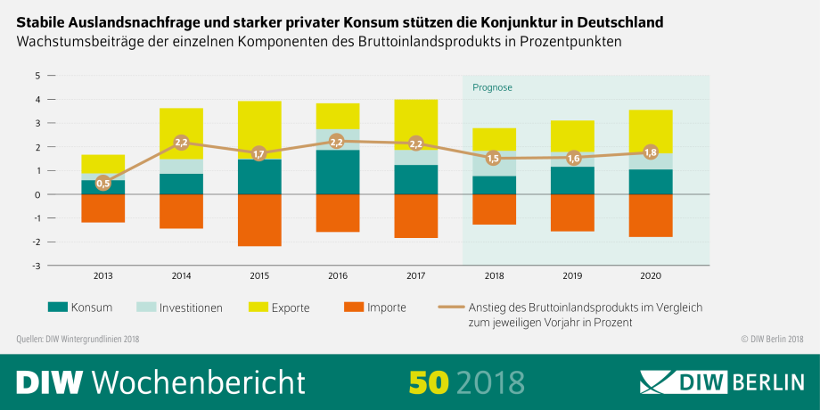 Die Zeiten der Hochkonjunktur in Deutschland sind vorbei: Nach einer bis in das Frühjahr 2018 anhaltenden außerordentlich starken Entwicklung normalisiert sich die Wachstumsdynamik der deutschen Wirtschaft. Sie wird in diesem und in den kommenden beiden Jahren aber weiter spürbar wachsen und sich der Normalauslastung nähern. Das Deutsche Institut für Wirtschaftsforschung (DIW Berlin) korrigiert seine Prognose für das Wachstum der hiesigen Wirtschaftsleistung nach unten: auf 1,5 Prozent für dieses Jahr (0,3 Prozentpunkte weniger im Vergleich zur Herbstprognose) und 1,6 Prozent für das kommende Jahr (0,1 Prozentpunkte weniger als im Herbst).