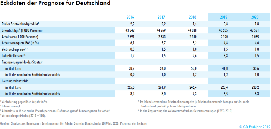 Die führenden deutschen Wirtschaftsforschungsinstitute haben ihre Prognose für das Wirtschaftswachstum im Jahr 2019 deutlich gesenkt. Für Deutschland erwarten sie eine Zunahme des Bruttoinlandsprodukts um 0,8 Prozent. Das ist mehr als ein Prozentpunkt weniger als im Herbst 2018, als man noch mit 1,9 Prozent rechnete. Hingegen bestätigen die Institute ihre vorherige Prognose für das Jahr 2020: Das Bruttoinlandsprodukt dürfte dann um 1,8 Prozent zunehmen. Das geht aus dem Frühjahrsgutachten der Gemeinschaftsdiagnose hervor, das am Donnerstag in Berlin vorgestellt wird.