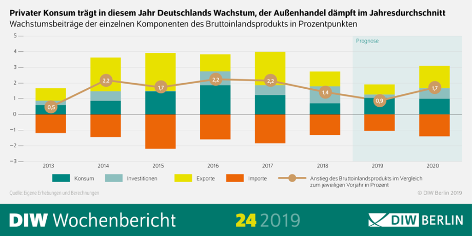 Das Bruttoinlandsprodukt (BIP) dürfte in diesem Jahr um 0,9 Prozent und im kommenden Jahr um 1,7 Prozent wachsen, so die aktuelle, im Vergleich zum Frühjahr geringfügig nach unten angepasst Prognose (Prognose aus dem März: 1,0 Prozent für 2019 und 1,8 Prozent für 2020) des Konjunkturteams am Deutschen Institut für Wirtschaftsforschung (DIW Berlin).