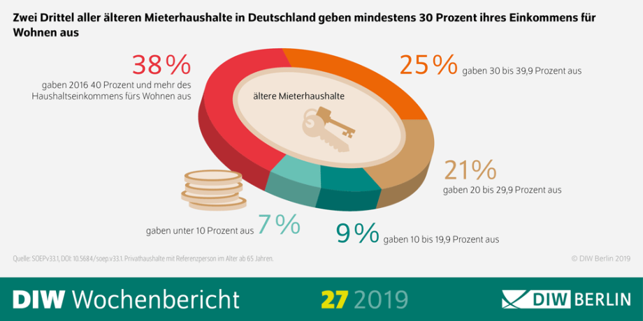 Eine hohe Belastung liegt vor, wenn die Wohnkosten eines Haushalts 30 Prozent und mehr seines Nettoeinkommens ausmachen. Das war im Jahr 2016 bei zwei Drittel der Mieterhaushalte mit einer Referenzperson ab 65 Jahren der Fall, so die Studie. Bei 38 Prozent der Mieterhaushalte kann sogar von einer Überbelastung durch die Wohnkosten gesprochen werden: Diese entsprechen 40 Prozent und mehr des Haushaltseinkommens. Zum Vergleich: Im Jahr 1996 waren 38 Prozent der Mieterhaushalte von einer hohen Belastung (über 30 Prozent) und 22 Prozent von einer Überbelastung (über 40 Prozent) betroffen.
