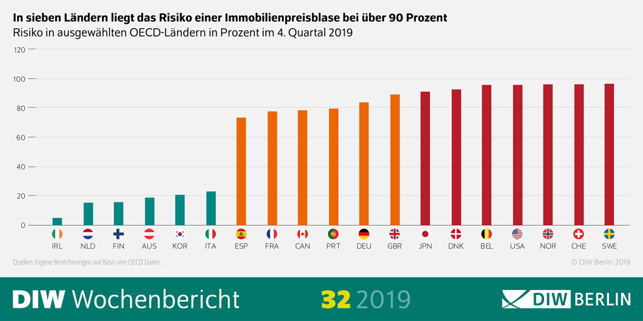 Die Sorge vor einer Immobilienpreisblase angesichts steigender Miet- und Kaufpreise wächst nicht nur in Deutschland, sondern weltweit. Zu einer Gefahr werden diese Preissteigerungen dann, wenn die Preisentwicklung auf reine Spekulation statt auf wertbestimmende Faktoren zurückzuführen ist. Dieses Risiko ist vor allem in einigen skandinavischen Ländern wie Schweden, Norwegen und Dänemark, aber auch in den USA, der Schweiz, Belgien und Japan derzeit sehr hoch. Hier droht mit einer Wahrscheinlichkeit von mehr als 90 Prozent im vierten Quartal 2019 eine spekulative Übertreibung. In Deutschland liegt das Risiko derzeit zwar auch bei 92 Prozent, nimmt aber bis Ende des Jahres auf 84 Prozent ab. Das ist das Ergebnis einer aktuellen Untersuchung des Deutschen Instituts für Wirtschaftsforschung (DIW Berlin).
