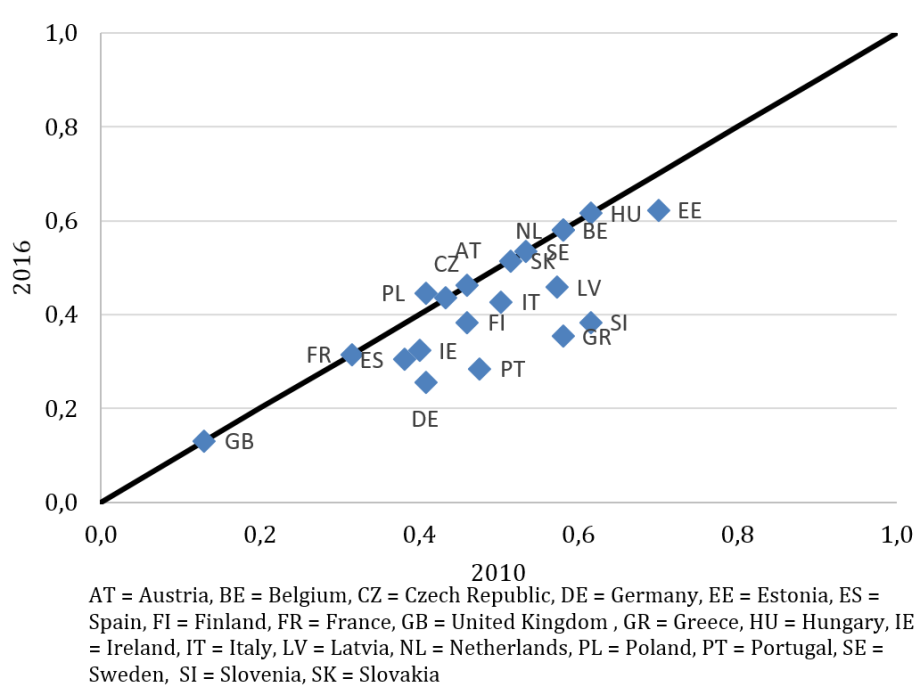 OECD index (low values = high efficiency), development between 2010 and 2016 (below the diagonal = improvement,