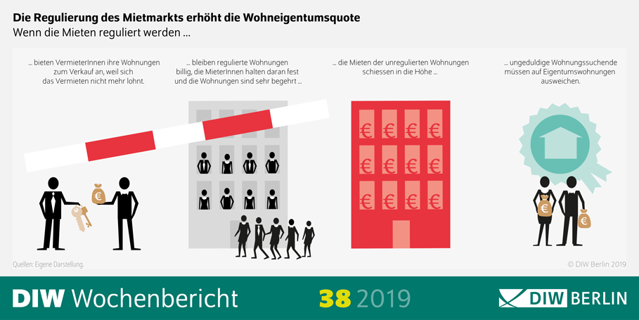Der Zusammenhang zwischen intensiver Mietmarktregulierung und steigender Wohneigentumsquote kann zwei Gründe haben, so Kholodilin und Ko-Autor Sebastian Kohl. Einerseits kann es sein, dass die VermieterInnen der regulierten Wohnungen diese nicht mehr profitabel vermieten können und sie zum Verkauf anbieten, was das Angebot an Mietwohnungen reduziert. Andererseits führt die Regulierung, die nur einen Teil der Wohnungen und Häuser betrifft, zu einem zweigeteilten Markt: auf der einen Seite ein regulierter Markt mit niedrigen Mieten, in dem die MieterInnen ihre Wohnungen nicht aufgeben und in den Wohnungssuchende vergeblich versuchen einzutreten; auf der anderen ein freier Markt mit sehr hohen Mieten, die sich nur wenige leisten können.