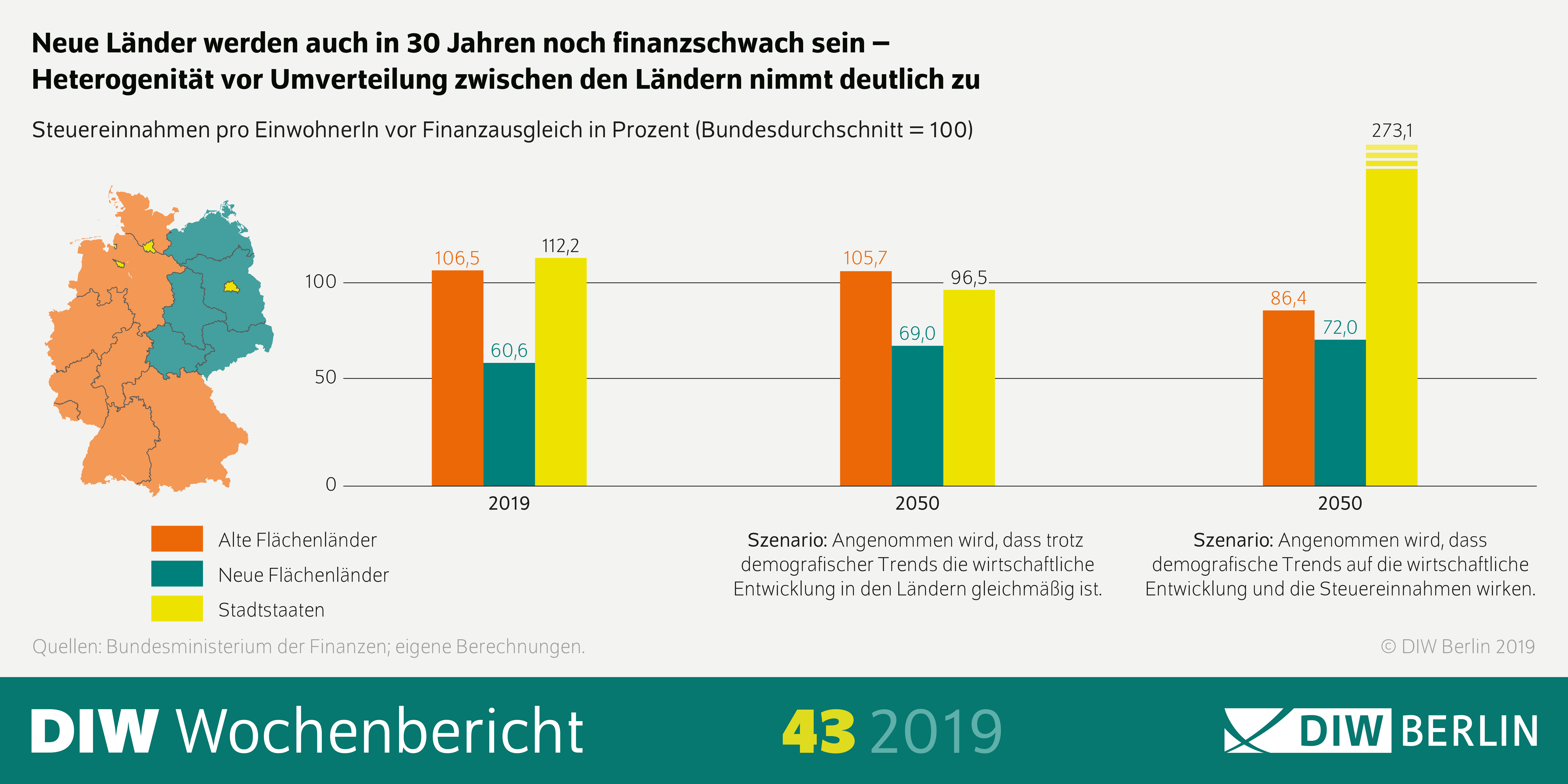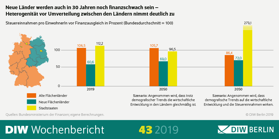 30 Jahre nach dem Fall der Mauer sind die neuen Länder noch immer finanzschwach – und sie werden es auch in drei Jahrzehnten noch sein. Das ist das zentrale Ergebnis einer neuen Studie des Deutschen Instituts für Wirtschaftsforschung (DIW Berlin). Obwohl im Zuge des Länderfinanzausgleichs seit Einbeziehung der neuen Länder im Jahr 1995 umfangreiche Zahlungen geflossen sind, unterscheiden sich die Länder nach wie vor deutlich in ihrer Wirtschafts- und Finanzkraft. So werden die originären Steuereinnahmen der neuen Flächenländer – Sachsen, Sachsen-Anhalt, Thüringen, Mecklenburg-Vorpommern und Brandenburg – vor der Umverteilung zwischen allen Ländern in diesem Jahr nur bei knapp 61 Prozent des Bundesdurchschnitts liegen. Die in der Studie berechneten Szenarien weisen darauf hin, dass es auch im Jahr 2050, also dann rund 60 Jahre nach dem Mauerfall, nur zwischen 70 und 80 Prozent sein dürften.