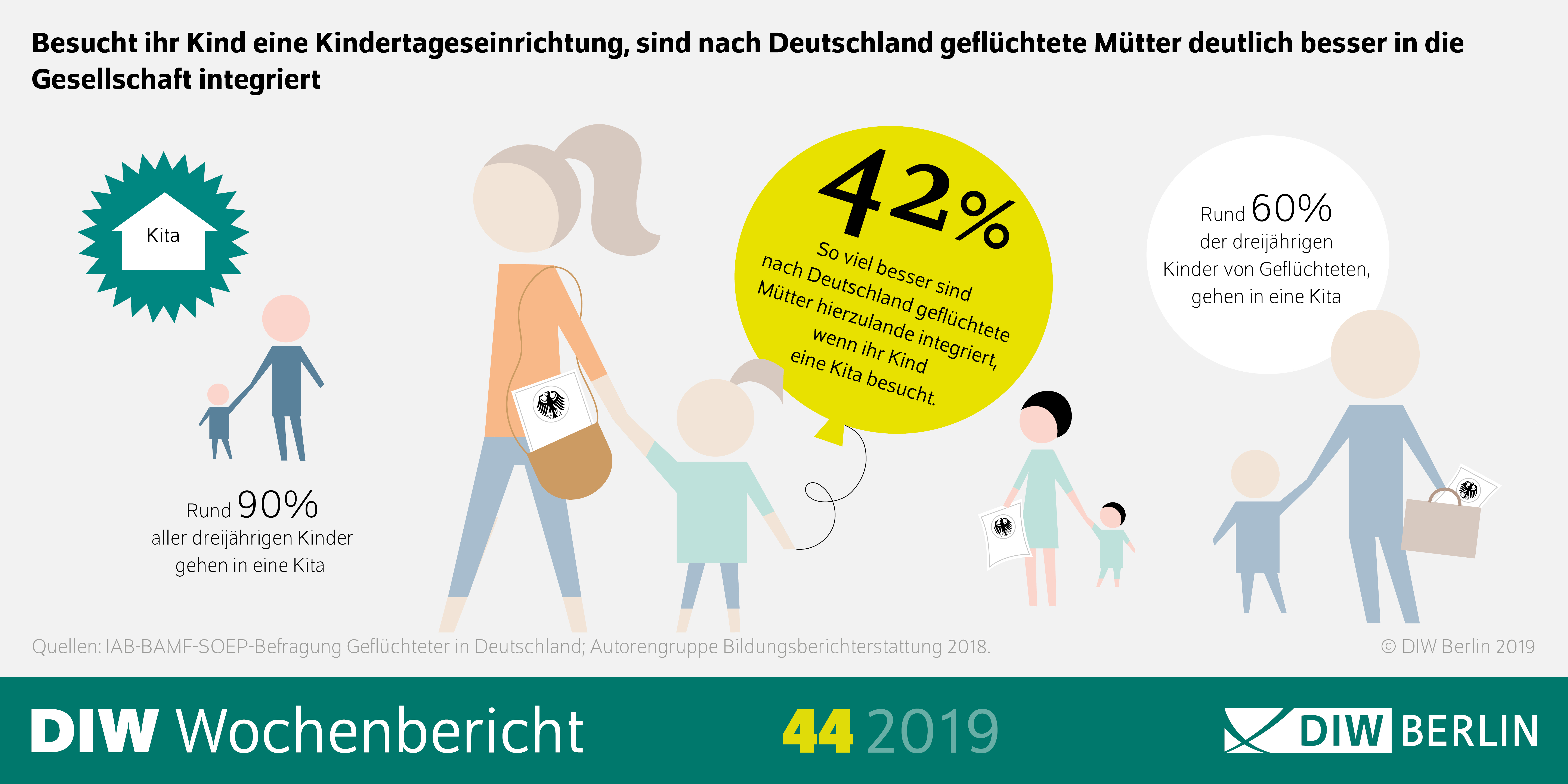 „Der Besuch einer Kita ist nicht nur für die Kinder aus geflüchteten Familien sehr wichtig, sondern nachweislich auch für deren Eltern – Kindertageseinrichtungen können also gleich eine doppelte Integrationsrendite erzielen“, sagt C. Katharina Spieß, Leiterin der Abteilung Bildung und Familie am DIW Berlin. Die mit einem Kita-Besuch verbundenen Chancen sollten geflüchteten Familien daher stärker vermittelt und genügend Plätze bereitgestellt werden, so die StudienautorInnen.