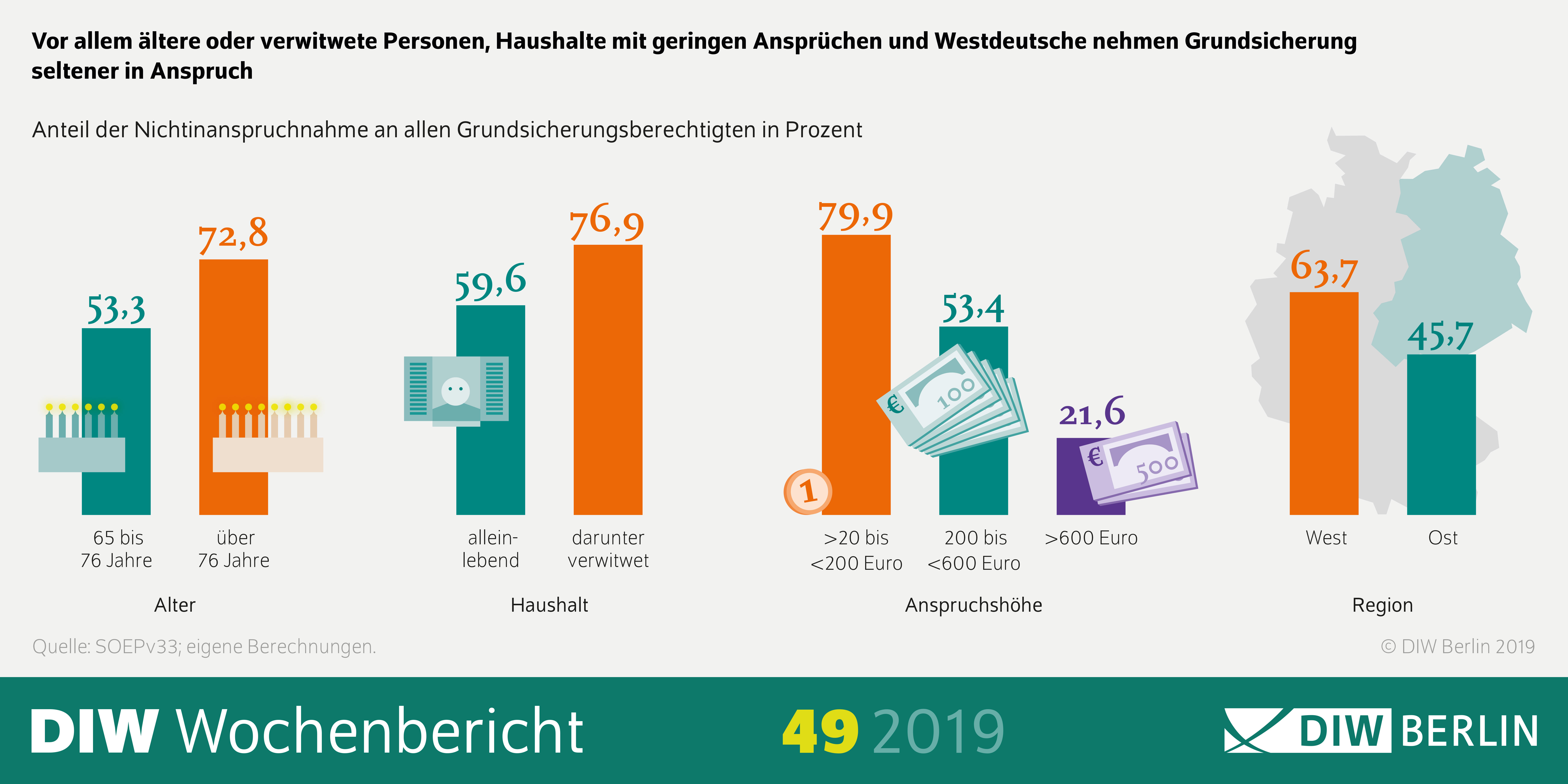 Besonders hoch ist die Quote bei Personen, die älter als 76 Jahre (73 Prozent) oder verwitwet (77 Prozent) sind. Auch ein niedriger Bildungsstatus geht damit einher, dass die Grundsicherung seltener in Anspruch genommen wird. Vor allem aber nehmen diejenigen, die monatliche Beträge bis 200 Euro aus der Grundsicherung zu erwarten haben, diese häufig nicht in Anspruch (80 Prozent). „Vielen ist das Verfahren vermutlich zu aufwendig – gerade bei kleinen Beträgen – oder sie wissen gar nicht, dass sie den Rechtsanspruch haben“, vermutet Studienautor Hermann Buslei. Auch die Angst, als „Almosenempfänger“ abgestempelt zu werden, könne eine Rolle spielen.