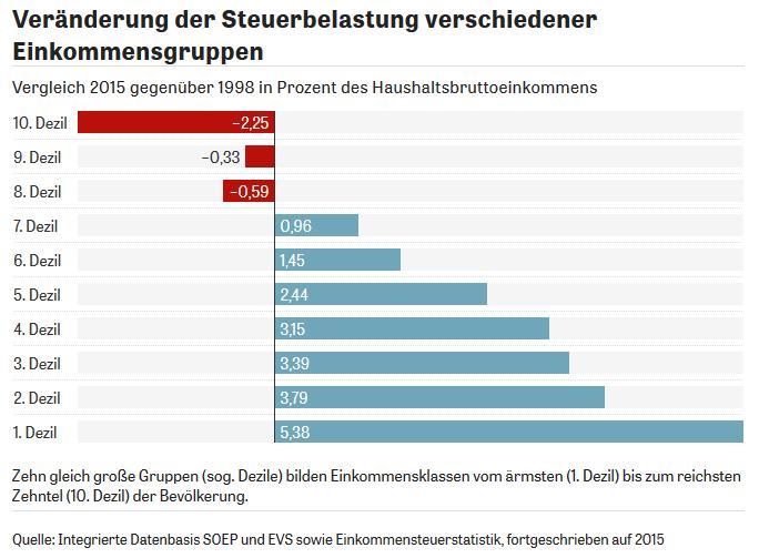 Werfen wir in diesem Zusammenhang auch einen kritischen Blick auf Steuersenkungen: Seit 1998 wurden die oberen 30 Prozent der Einkommen sukzessive steuerlich entlastet (durch ein Absenken des Spitzensteuersatzes und der Unternehmensteuern), die unteren 70 Prozent dagegen erheblich stärker belastet. In anderen Worten: Der Soli wurde in den vergangenen 20 Jahren für die Spitzenverdiener effektiv bereits dreimal abgeschafft. Die Hoffnung, eine weitere Abschaffung würde nun Investitionen anstoßen, darf also getrost als Illusion gesehen werden.