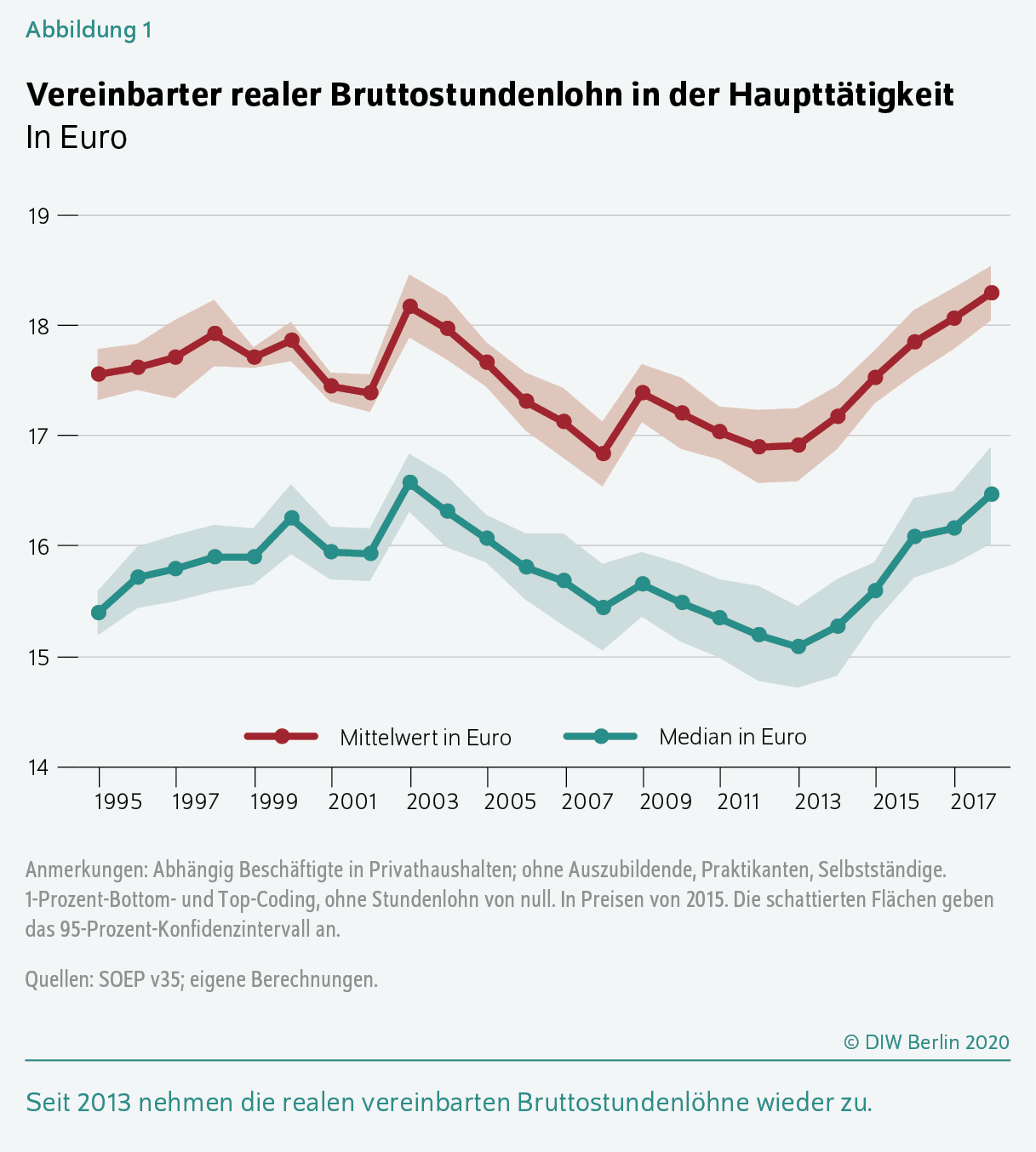 Der durchschnittliche realeIn Preisen von 2015, berechnet unter Verwendung des Verbraucherpreisindex des Statistischen Bundesamts. vereinbarte Bruttostundenlohn hat sich für abhängig Beschäftigte in Haupttätigkeit über den Beobachtungszeitraum von 1995 bis 2018 schwach entwickelt. Von etwa 17,60 Euro im Jahr 1995 stieg er auf 18,20 Euro im Jahr 2003, ging bis 2013 wieder auf rund 16,90 Euro zurück und stieg bis 2018 wieder an auf 18,30 Euro (Abbildung 1).Nominal lag der durchschnittliche vereinbarte Bruttostundenlohn im Jahr 2018 bei 19,00 Euro. Dies entspricht einem Anstieg von acht Prozent gegenüber 2013. Gemessen am MedianDer Medianlohn ist der Lohn, bei dem es genauso viele Menschen mit höheren wie mit niedrigeren Löhnen gibt. Würde man die Bevölkerung nach der Höhe ihrer Löhne sortieren und dann zwei gleich große Gruppen bilden, würde die Person, die genau in der Mitte dieser Verteilung steht, den Medianlohn beziehen. verlief die Entwicklung ähnlich. Zuletzt hat sich der Medianlohn aber etwas dynamischer entwickelt als der Durchschnitt und lag mit rund 16,50 Euro im Jahr 2018Nominal lag der Median des vereinbarten Bruttostundenlohns im Jahr 2018 bei 17,10 Euro. neun Prozent höher als 2013.