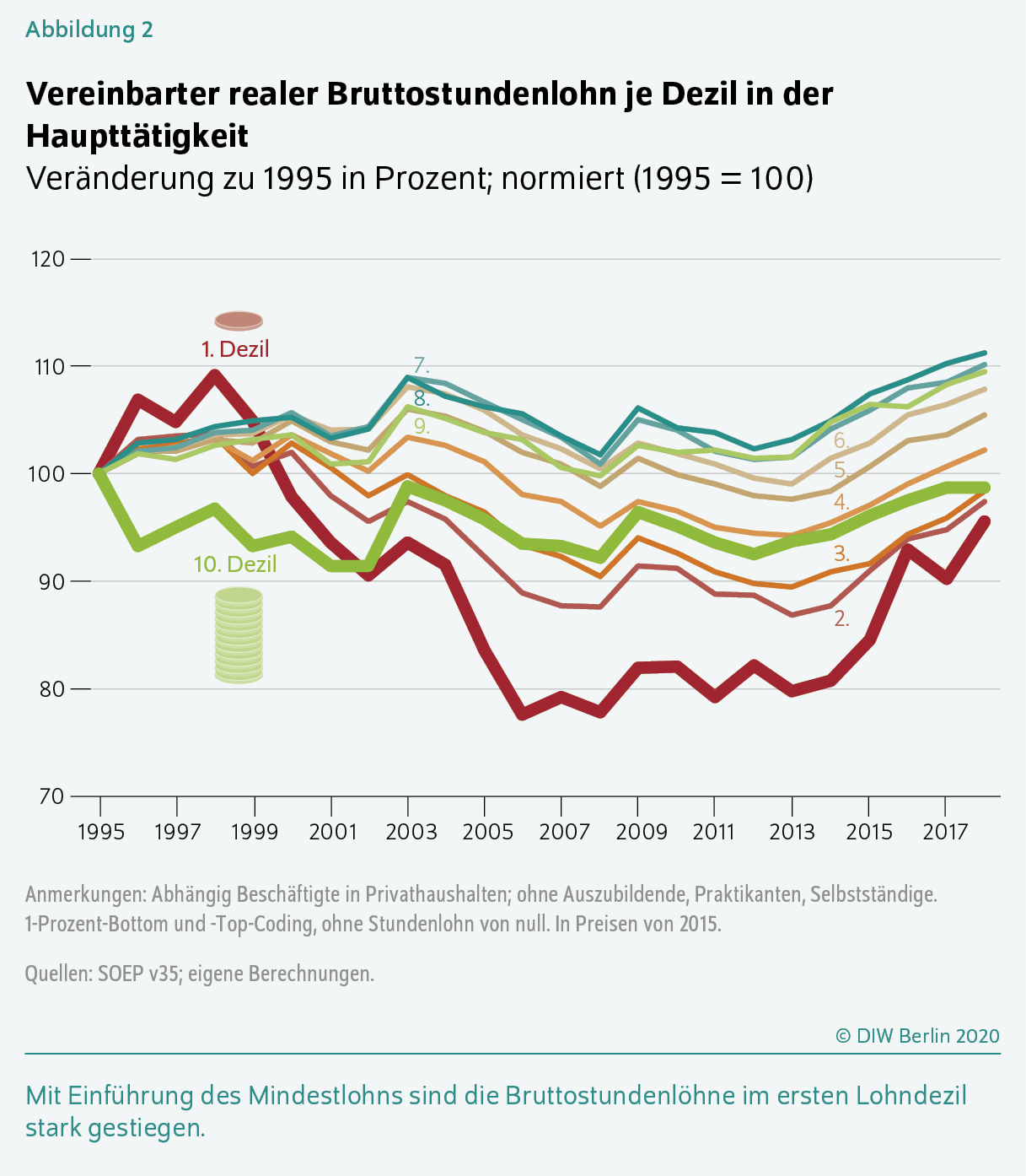 Die Entwicklung der realen vereinbarten Bruttostundenlöhne variiert dabei über die Dezile der Lohnverteilung. Diese erhält man, indem man die abhängig Beschäftigten nach der Höhe des vereinbarten Bruttostundenlohns sortiert und sie dann in zehn gleich große Gruppen (Dezile) aufteilt. Der Durchschnittslohn je Dezil ist auf das Jahr 1995 (= 100) normiert, so dass sich daran die prozentuale Veränderung ablesen lässt.