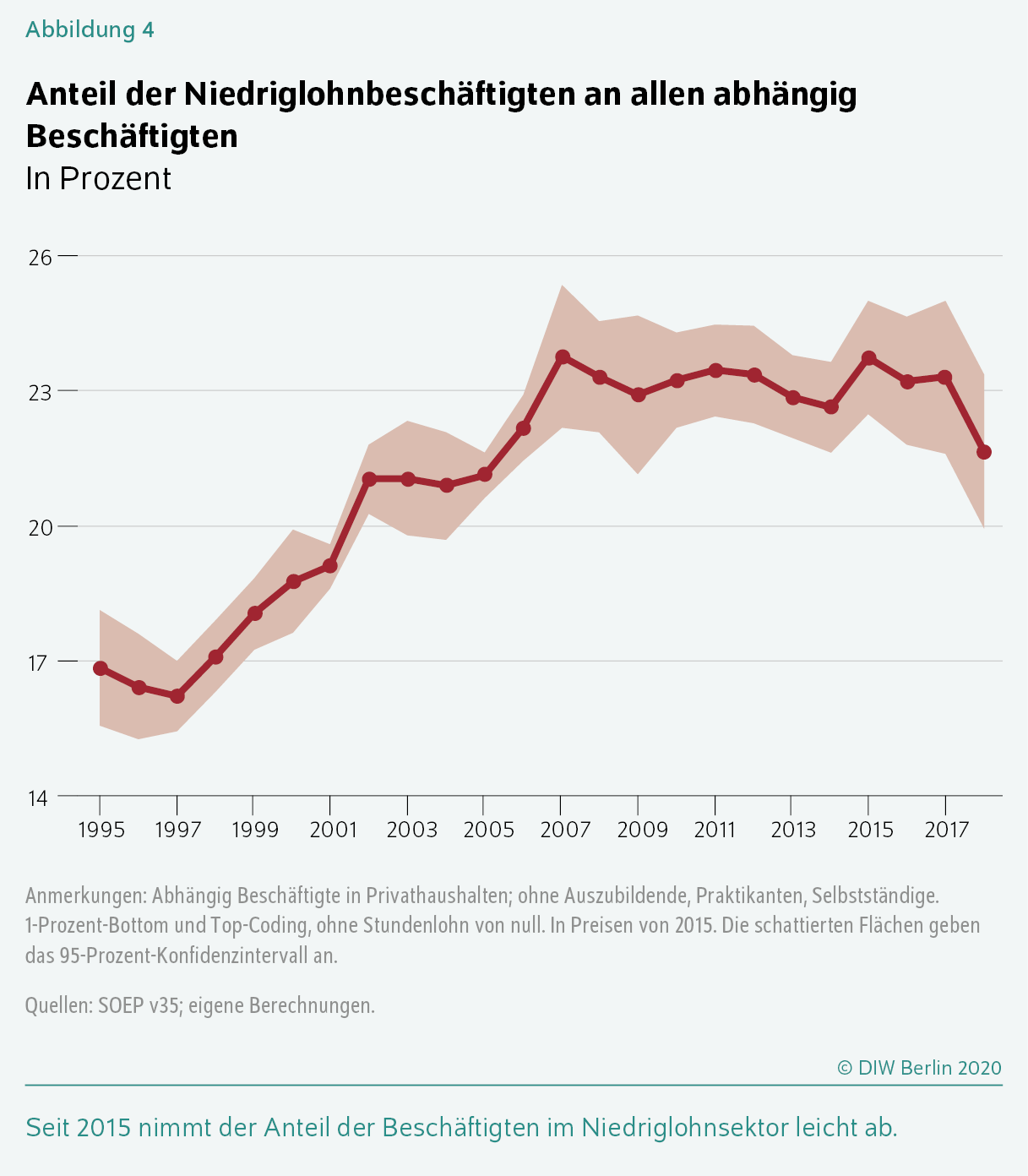 Mitte der 1990er Jahre liegt der Anteil abhängig Beschäftigter in Haupttätigkeit mit einem Niedriglohn bei rund 17 Prozent (Abbildung 4). Seit 1997 weitet sich dieser Anteil stark aus und erreicht einen Höchstwert von 23,8 Prozent im Jahr 2007. Seit 2015 schrumpft der Niedriglohnsektor: So ist der Anteil der abhängig Beschäftigten in Haupttätigkeit von 23,7 im Jahr 2015 auf 21,7 Prozent im Jahr 2018 zurückgegangen.Hier wird der Niedriglohnsektor entsprechend der gängigen Praxis auf Basis der Bruttostundenlöhne abgegrenzt. Vereinzelt wird der Niedriglohnsektor auch auf Grundlage von Bruttomonatslöhnen berechnet. Das hat zur Folge, dass für das Jahr 2018 keine relevante Veränderung beobachtet werden kann. Dies bedeutet, dass es Änderungen der Beschäftigten im Hinblick auf deren Arbeitszeit gegeben hat.