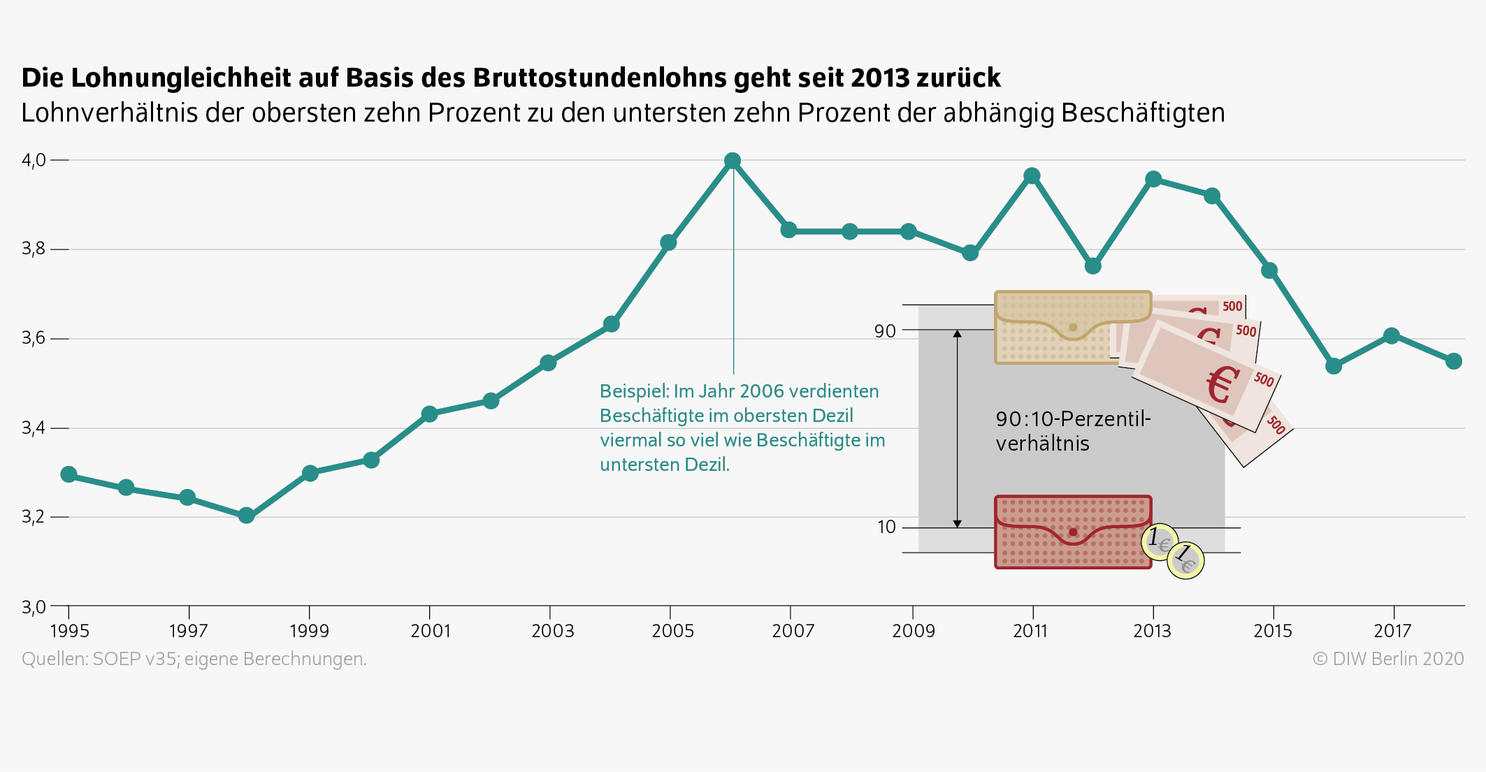 In der oberen Hälfte der Verteilung (90:50) steigt die Lohnungleichheit auch nach 2006 und sinkt erst 2013.