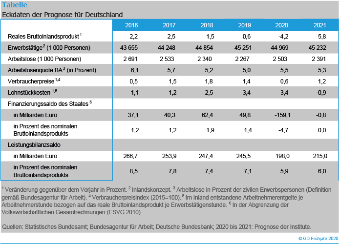 Die Corona-Pandemie löst eine schwerwiegende Rezession in Deutschland aus. Die Wirtschaftsleistung wird in diesem Jahr um 4,2 Prozent schrumpfen. Das erwarten die führenden Wirtschaftsforschungsinstitute in ihrem Frühjahrsgutachten. Für das kommende Jahr sagen sie eine Erholung und ein Wachstum von 5,8 Prozent voraus.
