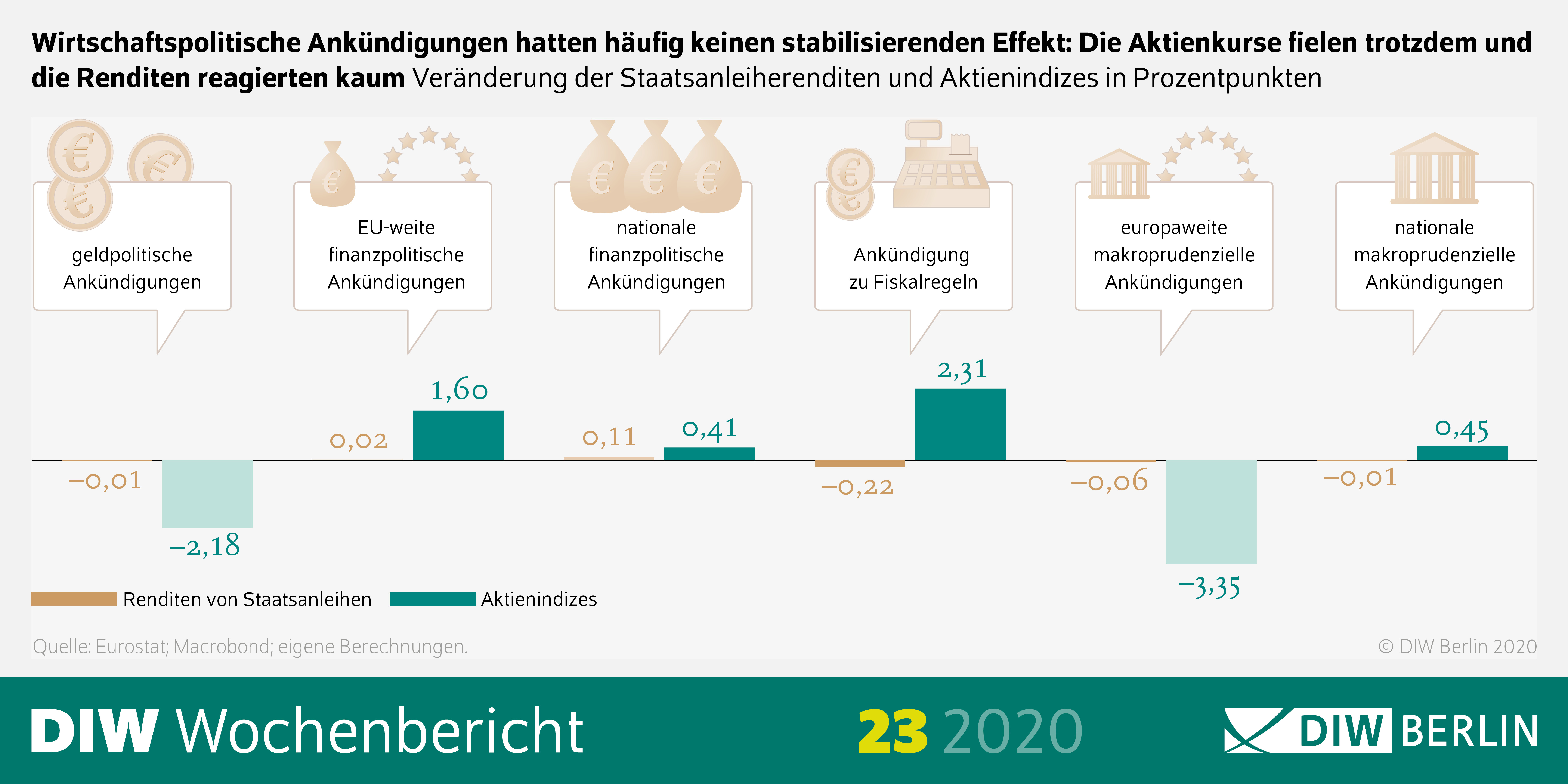 Die Corona-Krise hat Europa mit voller Wucht getroffen. Entsprechend umfangreich sind die wirtschaftspolitischen Gegenmaßnahmen, die auf Zentralbank-, EU- und nationaler Ebene getroffen wurden. Allein in Deutschland überschreiten die geplanten Hilfen und Garantien die Billionengrenze. Doch sind sie auch wirksam? Dieser Frage, die gerade vor dem Hintergrund des von der EU vorgeschlagenen Wiederaufbaufonds noch mal an Relevanz gewinnt, sind vier Ökonominnen und Ökonomen des Deutschen Instituts für Wirtschaftsforschung (DIW Berlin) in einer aktuellen Studie nachgegangen. Zwar lassen sich die langfristigen Effekte auf die Realwirtschaft zum jetzigen Zeitpunkt noch nicht quantifizieren, doch lässt sich bereits jetzt ablesen, dass die Ankündigungen an den Finanzmärkten im Schnitt kurzfristig nur geringfügig stabilisierend gewirkt haben.