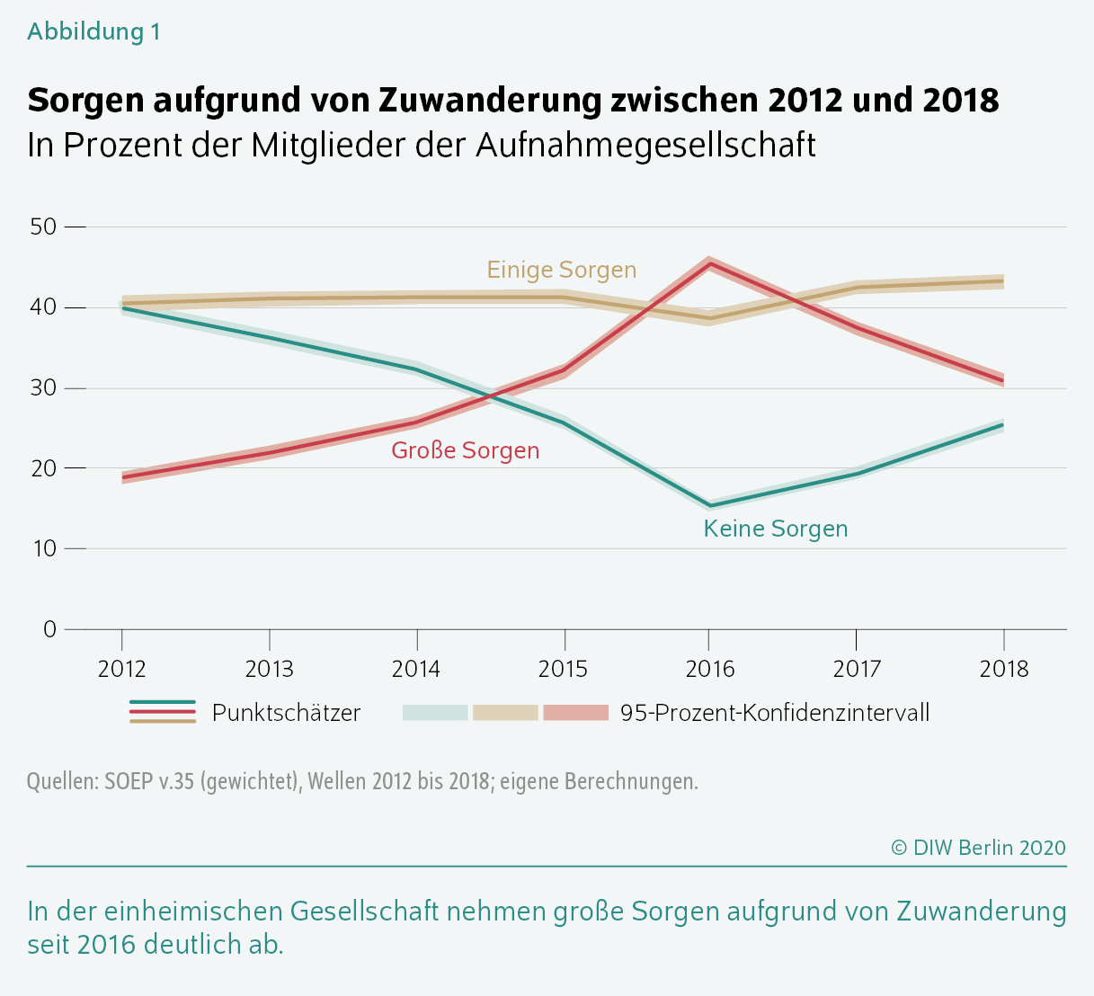 Die erfolgreiche Integration von Zuwanderern hängt unter anderem vom allgemeinen Meinungsklima in der aufnehmenden Gesellschaft ab.U.a. Christian S. Czymara und Alexander W. Schmidt-Catran (2016): Wer ist in Deutschland willkommen? Eine Vignettenanalyse zur Akzeptanz von Einwanderern. Kölner Zeitschrift für Soziologie und Sozialpsychologie, 68, 193–227; M. Verkuyten (2004): Emotional reactions to and support for immigrant policies: Attributed responsibilities to categories of asylum seekers. Social Justice Research, 17(3), 293–314. Erfahren Zugewanderte Ablehnung, zum Beispiel in Form sozialer Distanz oder von Diskriminierung, werden ihnen Chancen gesellschaftlicher Teilhabe erschwert. Aus diesem Grund wird zunächst das Stimmungsgefüge in der Aufnahmegesellschaft betrachtet. Hierzu werden in der SOEP-Befragung jährlich die Sorgen erfragt, die sich die Befragten zum Thema Zuwanderung machen. Die Antwortkategorien reichen von „keine Sorgen“ über „einige Sorgen“ bis zu „große Sorgen“.