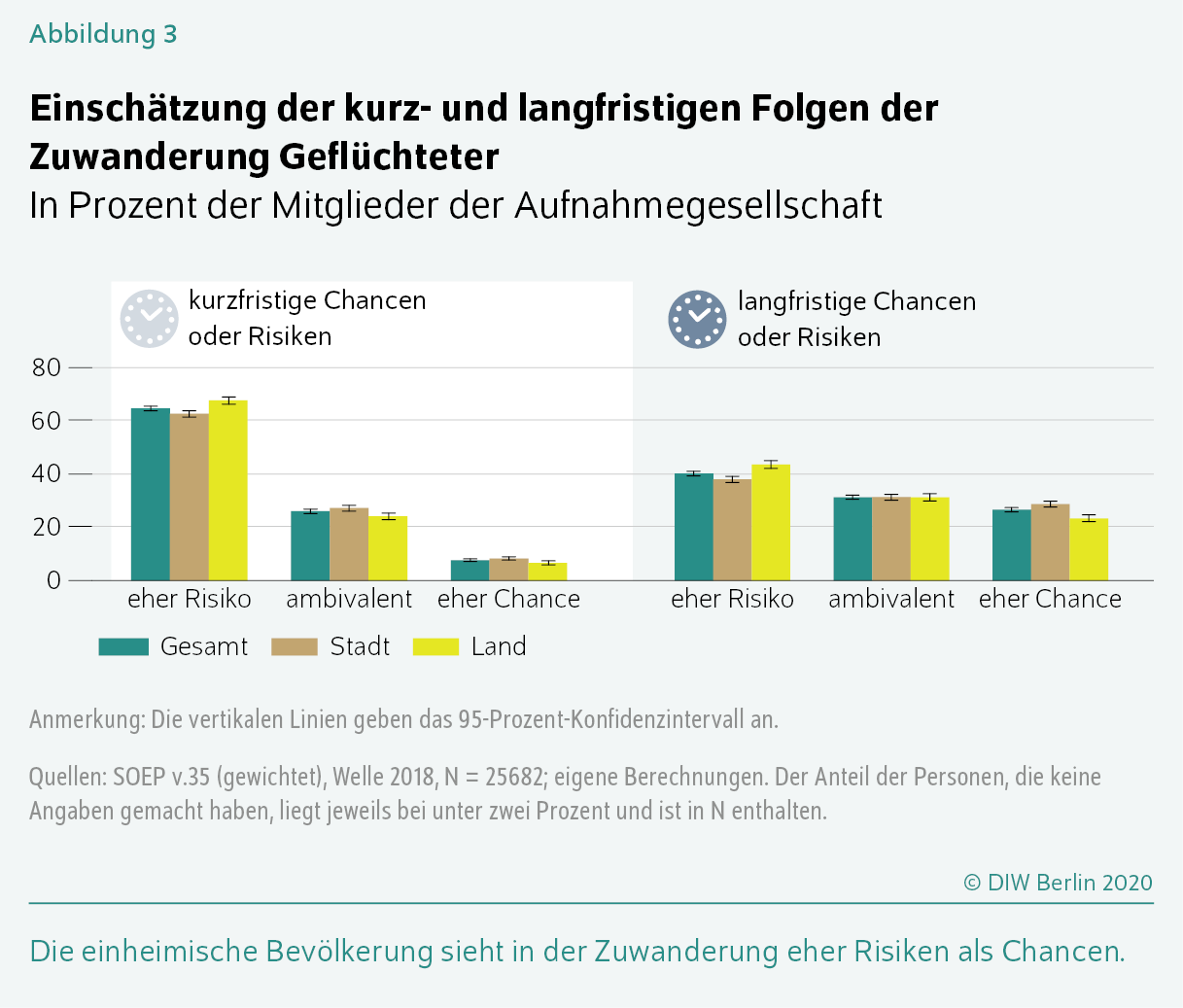 In der öffentlichen Debatte über die Einwanderung Geflüchteter seit 2015 sind zwei wichtige Aspekte zu beobachten: Die Reaktion der hier lebenden Bevölkerung auf die gewachsene Fluchtzuwanderung und die Integration der Geflüchteten in den Arbeitsmarkt sowie in das Bildungs- und Ausbildungssystem. Während die Einschätzung der ansässigen Bevölkerung bislang eher ambivalent war – einerseits geprägt von Engagement für Geflüchtete, andererseits gezeichnet von großen Sorgen über ZuwanderungJannes Jacobsen, Philipp Eisnecker und Jürgen Schupp (2017): Rund ein Drittel der Menschen in Deutschland spendeten 2016 für Geflüchtete, zehn Prozent halfen vor Ort – immer mehr äußern aber auch Sorgen. DIW Wochenbericht Nr. 17, 347–358 (online verfügbar, abgerufen am 20. Juli 2020. Dies gilt, insofern nicht anders vermerkt, für alle Onlinepublikationen in diesem Bericht). – wurde für Geflüchtete eine vergleichsweise schnelle und gelungene Integration konstatiert.Herbert Brücker et al. (2019): Geflüchtete machen Fortschritte bei Sprache und Beschäftigung. DIW Wochenbericht Nr. 4, 55–70 (online verfügbar).,Herbert Brücker, Yuliya Kosyakova und Eric Schuß (2020): Integration in Arbeitsmarkt und Bildungssystem macht weiter Fortschritte. IAB-Kurzbericht Nr. 4 (online verfügbar). Für den Zusammenhalt einer Gesellschaft spielen allerdings noch weitere, auch subjektive Aspekte von Integration eine wichtige Rolle. Darunter fallen beispielsweise das Ausmaß der Sorgen von Geflüchteten, die von ihnen wahrgenommene Diskriminierung, ihr Vertrauen in Institutionen sowie ihre Möglichkeiten, mit Mitgliedern der Aufnahmegesellschaft in Kontakt zu treten. Diese Aspekte gilt es in Bezug zu den Einstellungen, Erwartungen und Gefühlen der Mitglieder der Aufnahmegesellschaft zu setzen.
