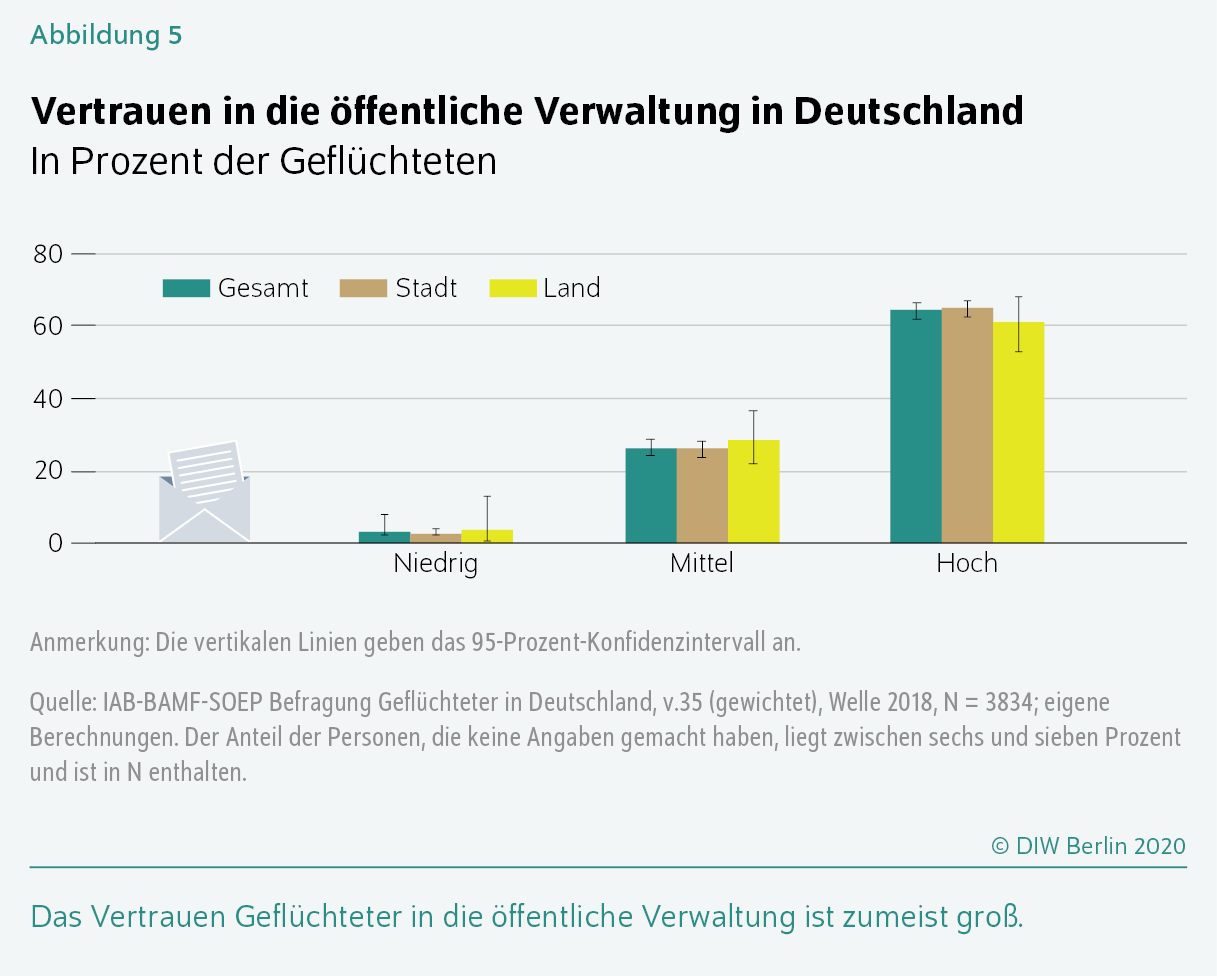 Ein weiterer Indikator, um ein Bild des Einlebens und Eingewöhnens der Zugewanderten zu beschreiben, ist das geäußerte Vertrauen in zentrale Institutionen des Staates: die öffentliche Verwaltung, die Polizei, die Gerichte. Dies ist aus zweierlei Perspektive von Relevanz. Erstens kommen Geflüchtete aufgrund ihrer Einwanderungsgeschichte und Asylbegehren regelmäßig mit der Verwaltung und in einigen Fällen mit der Polizei und den Gerichten in Kontakt. Ein hohes Vertrauen in diese Institutionen ist somit auch ein Indikator für die Akzeptanz, die dem Handeln dieser Institutionen entgegengebracht wird. Daher spiegelt, zweitens, das Vertrauen in diese Institutionen auch das Vertrauen in ein gerechtes Funktionieren des Rechtsstaates wider. Dieses sollte im Idealfall hoch sein.