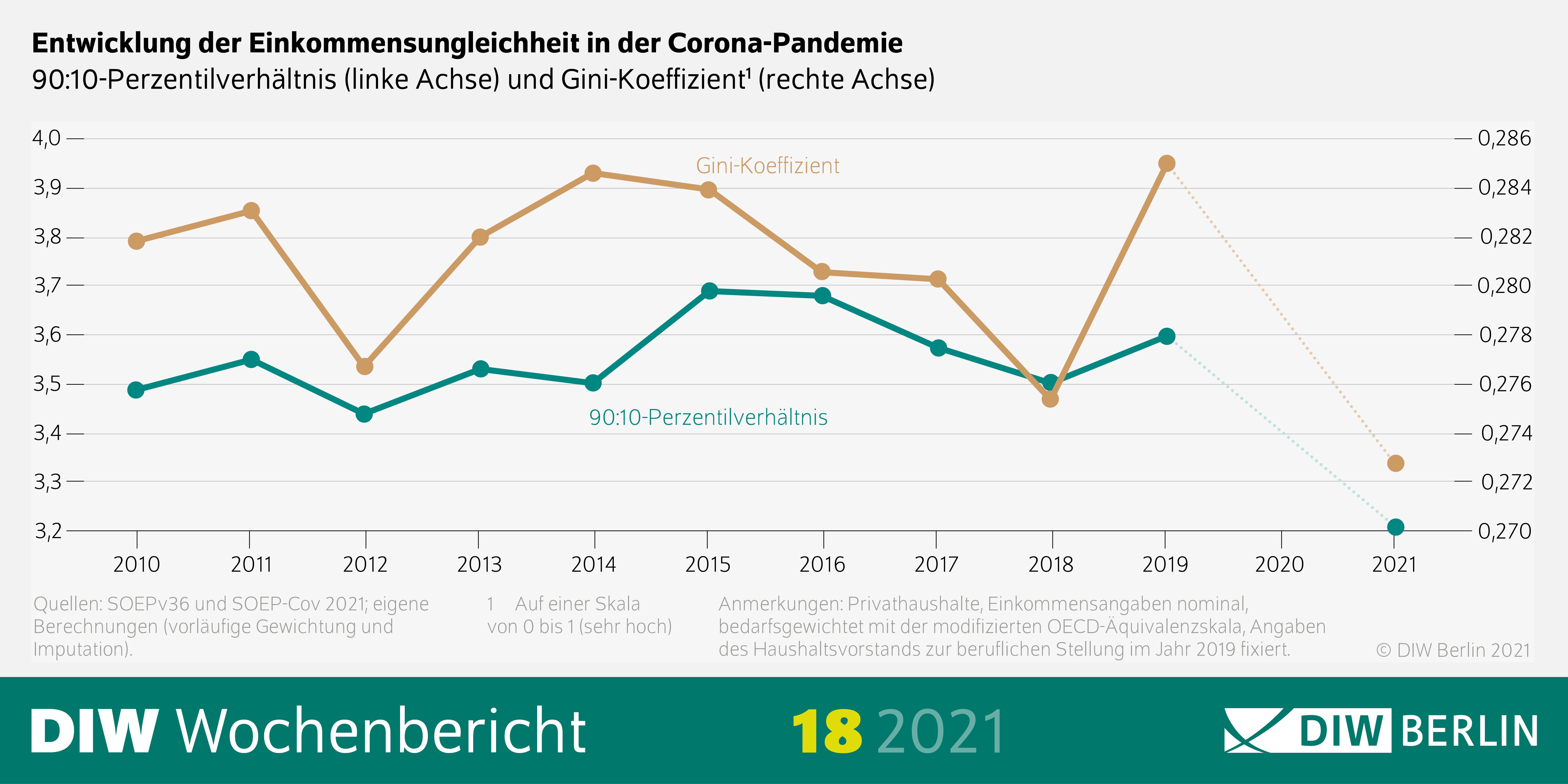 Der Gini-Koeffizient als Standardmaß für die Ungleichheit ist dadurch von 0,29 auf nun 0,27 gesunken. „Die sinkende Ungleichheit ist allerdings nur eine Momentaufnahme. Zieht sich die Pandemie noch weit in das Jahr hinein und verschärfen sich die Eindämmungsmaßnahmen noch einmal, könnte dies mit steigenden Insolvenzzahlen und zunehmender Arbeitslosigkeit einhergehen und auch die Einkommenssituation in der Breite treffen“, gibt Studienautor Grabka zu bedenken.