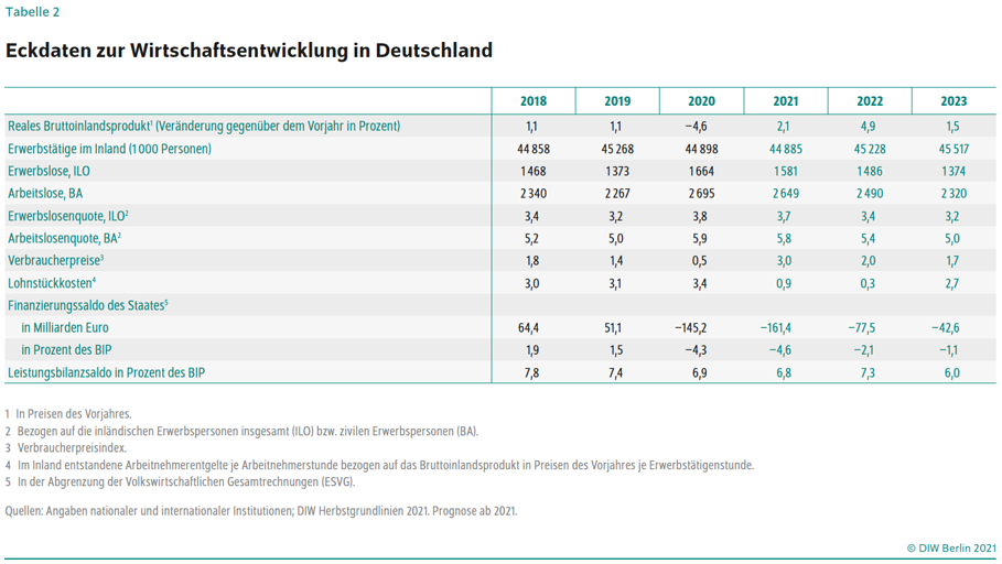DIW-KonjunkturforscherInnen senken Prognose für 2021 von 3,2 auf 2,1 Prozent – Lieferengpässe und Materialknappheit belasten deutsche Industrie – Privater Konsum noch verhalten – Erst im kommenden Jahr könnte die deutsche Wirtschaft mit einem Plus von knapp fünf Prozent Fahrt aufnehmen, wenn Engpässe überwunden und Infektionszahlen nachhaltig gesunken sind – Inflation kein Grund zur Sorge