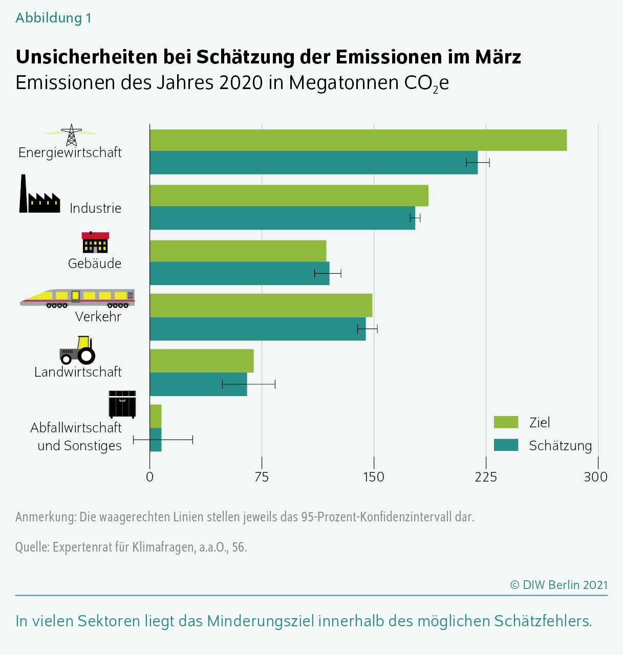 Beispielsweise lagen die durchschnittlichen jährlichen Korrekturen zwischen den Vorjahresschätzungen und den finalen Emissionsdaten im Bereich der Landwirtschaft zwischen 2010 und 2018 bei 3,4 Prozent und im Bereich der Abfallwirtschaft bei 11,3 Prozent.Expertenrat für Klimafragen (2021): Bericht zur Vorjahresschätzung der deutschen Treibhausgasemissionen für das Jahr 2020, 9 (online verfügbar). Die Korrekturen resultieren daraus, dass Statistiken für einige Teilbereiche der Wirtschaft erst verzögert verfügbar sind und daher auf die Vorjahresschätzung, basierend zum Beispiel auf Aktivitätsdaten, zurückgegriffen wird. Außerdem besteht eine Unsicherheit bei der Erfassung der Emissionen in einigen Bereichen wie beispielsweise bei den Methanemissionen in der Abfallwirtschaft.Expertenrat für Klimafragen (2021), a.a.O., 9. Im Falle der Klimaziele für das Jahr 2020 haben diese Ungenauigkeiten dazu geführt, dass es im Landwirtschafts- und Abfallwirtschaftssektor nicht möglich war, eindeutig zu bestimmen, ob die Klimaziele erreicht wurden oder nicht.In seiner Bewertung der Emissionsminderungen kommt der Expertenrat zum Schluss, dass das Minderungsziel im Falle der Sektoren „Gebäude“, „Verkehr“, „Abfallwirtschaft“ und „Landwirtschaft“ innerhalb des 95-Prozent-Konfidenzintervalls liegt. In Anbetracht dieser relativ großen Unsicherheiten kommt der Expertenrat im Bereich der Landwirtschaft und Abfallwirtschaft zum Ergebnis, dass ein Erreichen der Ziele in diesen Sektoren „ebenso wahrscheinlich wie nicht wahrscheinlich“ sei. Obwohl die Ziele nach der Vorjahresschätzung erreicht wurden, ist es also durchaus möglich, dass die Emissionsmenge nach der Korrektur doch noch über dem Zielwert liegt (Expertenrat für Klimafragen, a.a.O, 10ff. und 69). Während im Verkehrssektor das Emissionsziel vermeintlich erreicht und im Gebäudesektor verfehlt wurde, besteht eine Restwahrscheinlichkeit von jeweils mehr als fünf Prozent des gegenteiligen Ergebnisses (Abbildung 1).