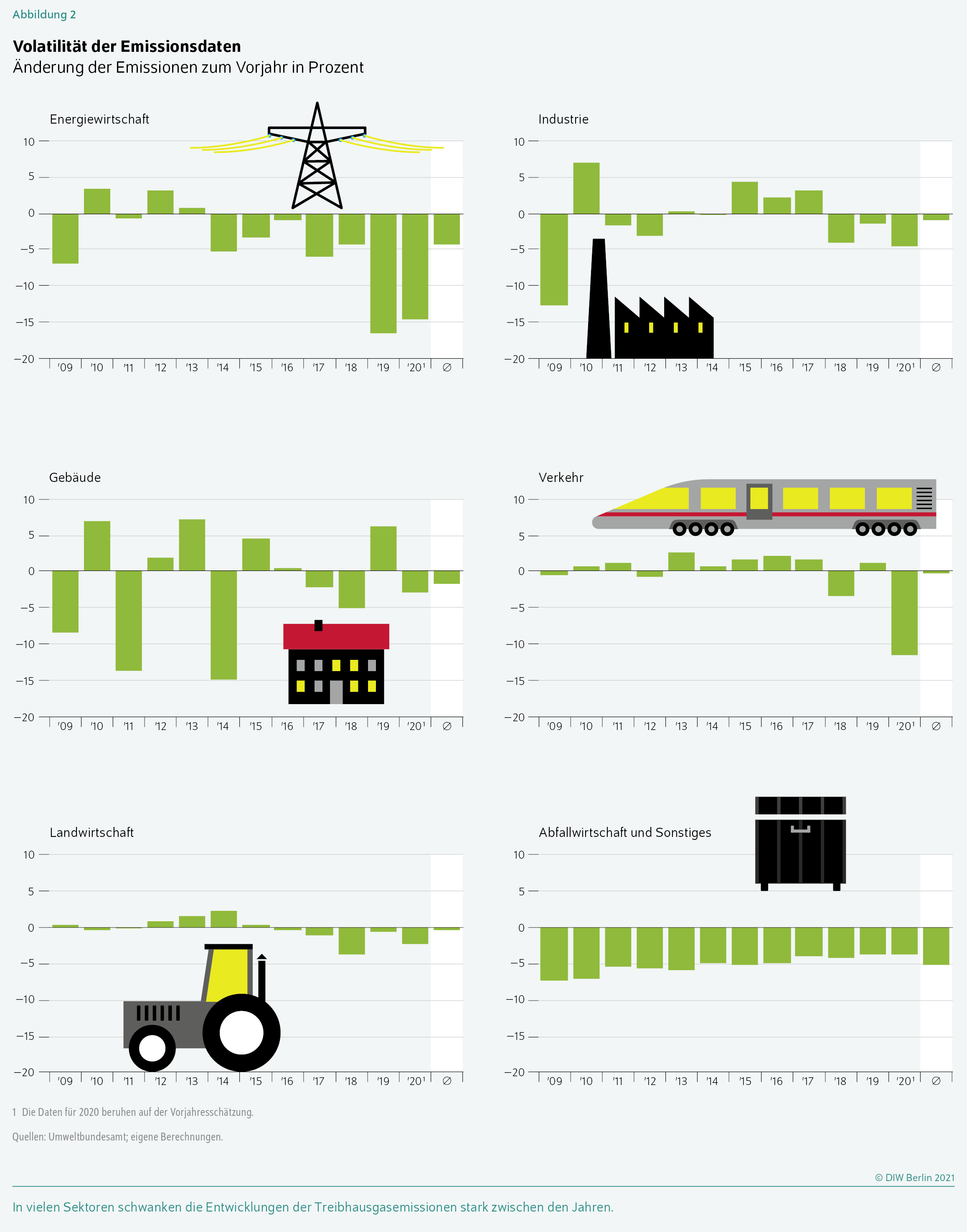Die Emissionsänderungen sind insbesondere auf Sektorebene des Klimaschutzgesetzes sehr volatil (Abbildung 2). Im Bereich der Industrie schlagen sich die Schwankungen der konjunkturellen Entwicklung sehr stark nieder,Umweltbundesamt (2021): Berichterstattung unter der Klimarahmenkonvention der Vereinten Nationen und dem Kyoto-Protokoll 2021 – Nationaler Inventarbericht zum Deutschen Treibhausgasinventar 1990–2019, 142 (online verfügbar). wie die negativen Emissionsentwicklungen in den Jahren 2009 und 2020, aber auch der „Recovery“-Effekt im Jahr 2010 zeigen. Im Bereich der Energiewirtschaft sind sowohl wirtschaftliche Entwicklungen und fluktuierende Produktionsmengen der erneuerbaren Energien als auch Änderungen in den Preisen fossiler Energieträger zu erkennen.Expertenrat für Klimafragen (2021), a.a.O., 74. Im Gebäudebereich schließlich sind die starken Schwankungen vor allem durch die wechselnden Witterungsbedingungen zwischen den Jahren zu erklären.Bundesumweltministerium (2021): Klimaschutz in Zahlen, 40 (online verfügbar). Im Verkehrssektor zeigt sich im Jahr 2020 besonders stark die Auswirkung der Corona-Beschränkungen.