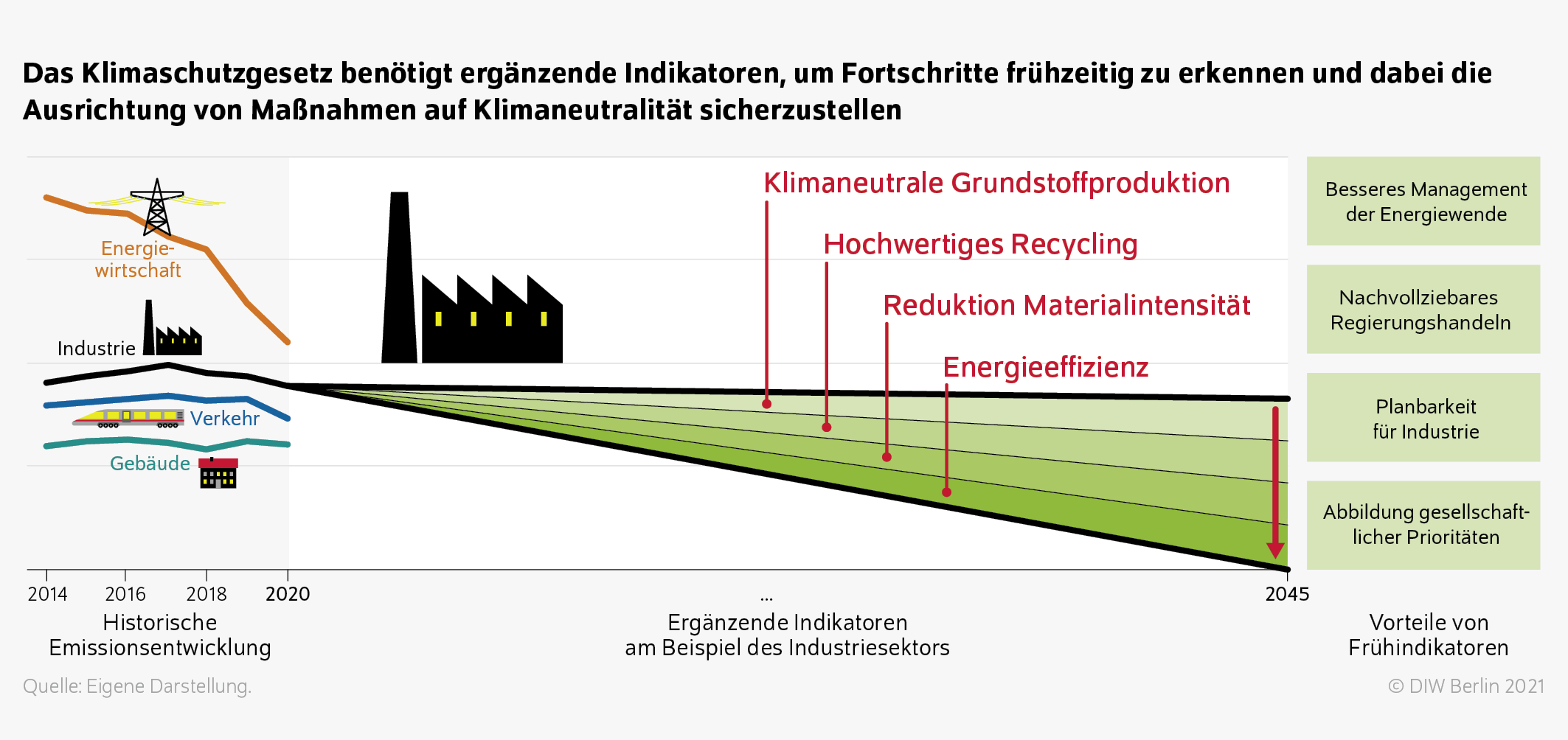 Das Klimaschutzgesetz geht mit der Definition der Reduktionspfade für die Sektoren einen wichtigen Schritt hin zu einer Konkretisierung des allgemeinen Ziels der Klimaneutralität. Doch die im Gesetz vorgesehenen Indikatoren weisen erhebliche Defizite auf, die im Folgenden diskutiert werden.