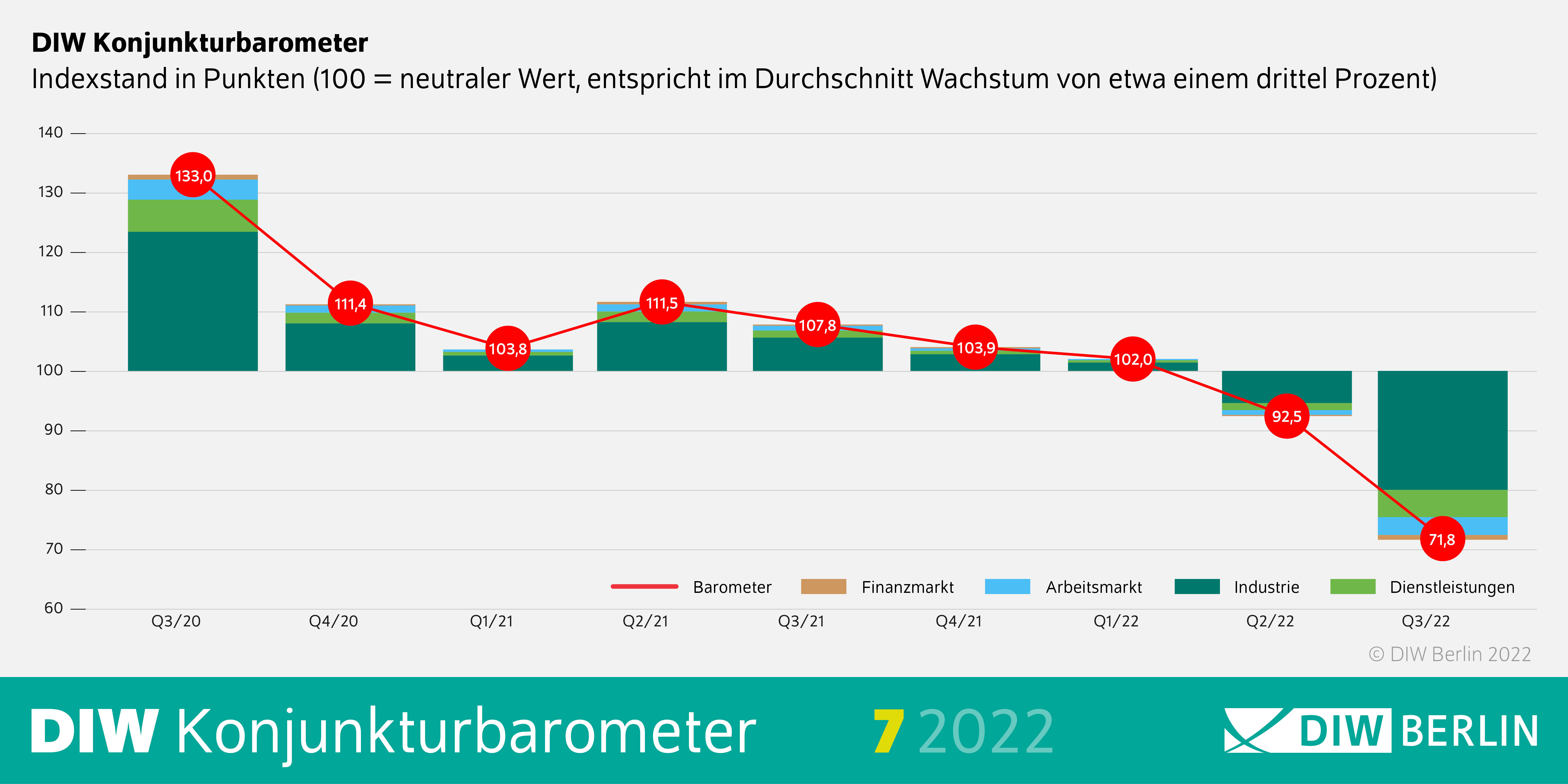 Das Konjunkturbarometer des Deutschen Instituts für Wirtschaftsforschung (DIW Berlin) ist im Juli auf 71,8 Punkte eingebrochen. Es liegt damit für das dritte Quartal weit unter der 100-Punkte-Schwelle, die ein durchschnittliches Wachstum der deutschen Wirtschaft anzeigen würde. Zum Vergleich: Für das zweite Quartal lag der Indexstand zuletzt noch bei über 90 Punkten.