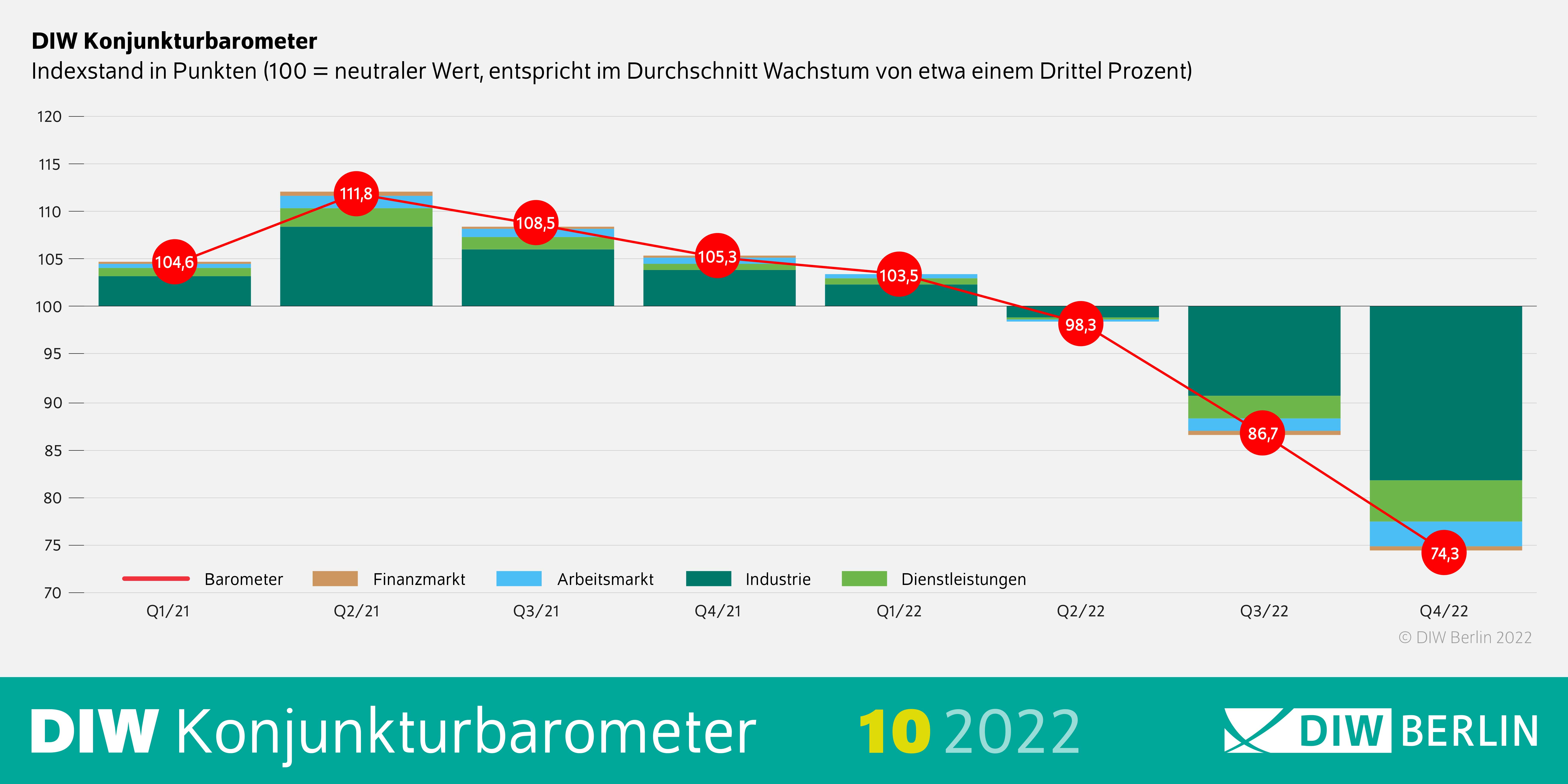Das Konjunkturbarometer des Deutschen Instituts für Wirtschaftsforschung (DIW Berlin) ist im Oktober noch einmal deutlich gesunken. Es liegt nun bei 74,3 Punkten, gut fünf Punkte niedriger als im Vormonat, und damit nun noch einmal weiter weg von der 100-Punkte-Marke, die ein durchschnittliches Quartalswachstum von 0,3 Prozent anzeigen würde. „Deutschland ist in eine Rezession geschlittert. Sofern keine Gasmangellage eintritt, dürfte die Wirtschaft aber deutlich weniger schrumpfen als während der Finanzkrise oder im ersten Jahr der Corona-Pandemie“, sagt DIW-Konjunkturexperte Guido Baldi. „Die Risiken für den weiteren Verlauf bleiben aber erheblich.“