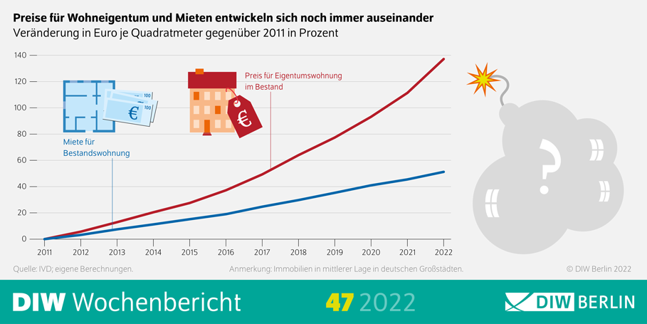 Den Berechnungen zufolge, die auf Daten des Immobilienverbandes IVD für die Jahre 1996 bis 2022 basieren, haben sich die Preise für Einfamilien- und Reihenhäuser im vergangenen Jahrzehnt in etwa verdoppelt. Eigentumswohnungen wurden im selben Zeitraum um rund 150 Prozent teurer, Baugrundstücke um etwa 130 Prozent. Die Mieten stiegen mit durchschnittlich 56 Prozent zwar ebenfalls, in vielen Fällen aber deutlich weniger stark als die Preise für Wohneigentum. Eine Immobilie kostete in Großstädten zuletzt so viel wie 28 Jahresmieten – ein Höchststand seit Mitte der 1990er Jahre. Untersucht wurden 97 Städte, für die über die Jahre ausreichende und lückenlose Preisinformationen zur Verfügung standen.