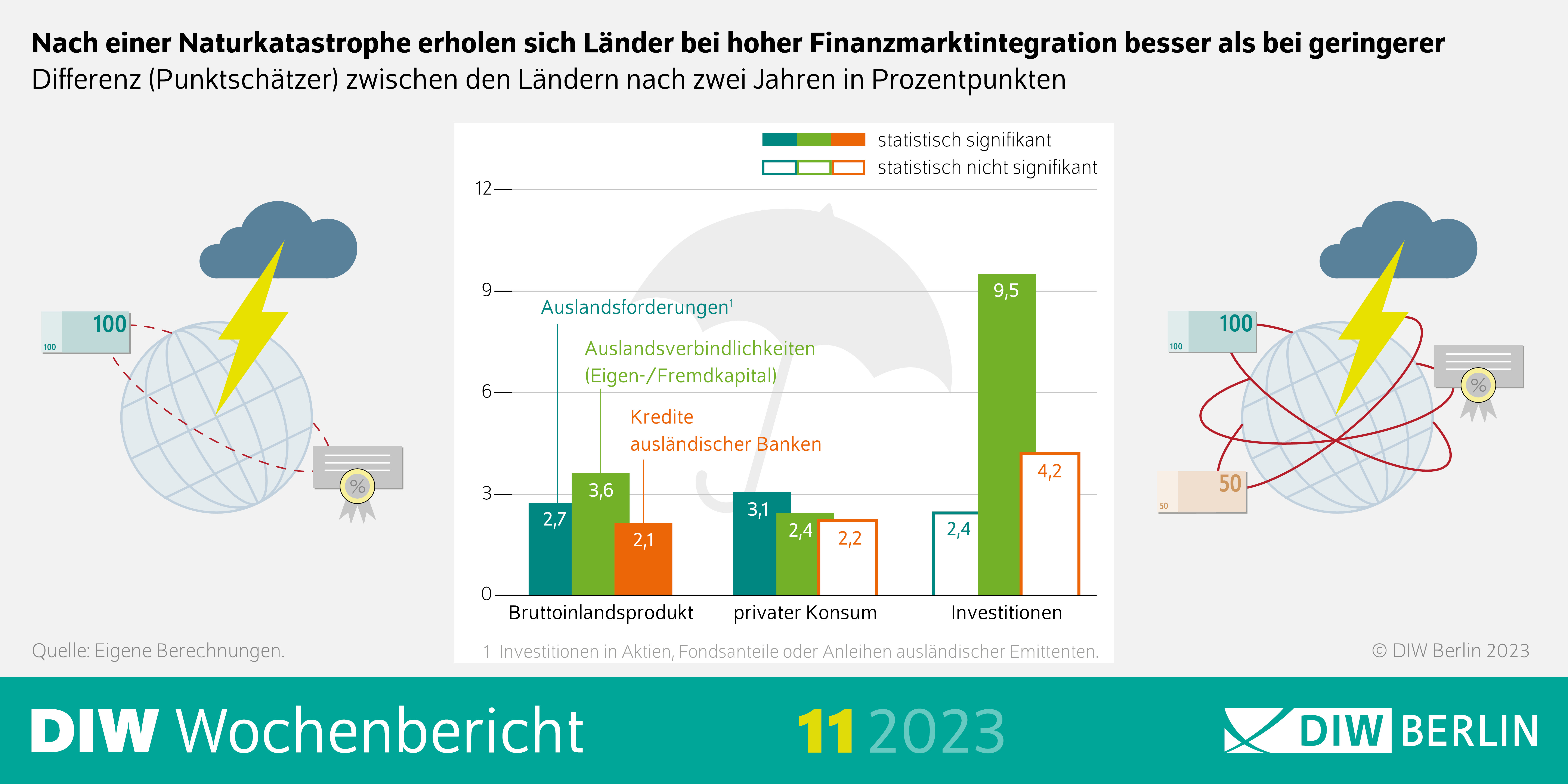 Internationale Verflechtungen auf den Finanzmärkten entstehen sowohl durch Auslandsforderungen wie grenzüberschreitende Wertpapieranlagen als auch durch Auslandsverbindlichkeiten, beispielsweise Eigenkapital aus dem Ausland oder Kredite bei ausländischen Banken. Wenn eine Naturkatastrophe ein Land trifft, sinkt in der Regel zunächst die Produktion und in Folge der private Konsum. Wird ein solcher Schock durch Finanzmarktverflechtungen aber über viele Länder verteilt, tragen ausländische Gläubiger einen Teil der Verluste mit, und zur Finanzierung des Wiederaufbaus kann Kapital aus dem Ausland genutzt werden. Außerdem können Zinseinkünfte auf Kapitalanlagen im Ausland oder Gewinnbeteiligungen an ausländischen Unternehmen das Einkommen der heimischen Wirtschaftsakteure stützen.