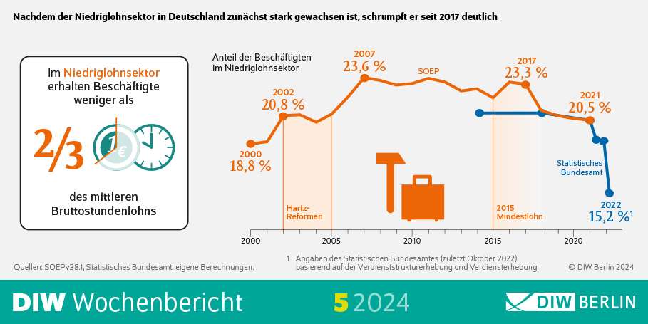 „Der Anteil der Beschäftigten im Niedriglohnsektor ist auf einen Tiefstand der letzten 25 Jahre gefallen“, erklärt Studienautor Markus M. Grabka. Eine der Ursachen hierfür liegt in der Einführung und den schrittweisen Erhöhungen des Mindestlohns. „Aber auch die veränderte Lohnpolitik der Gewerkschaften, die zunehmend auf Mindestzahlungen für untere Lohngruppen setzt, wirkt sich auf den Niedriglohnsektor positiv aus.“ So arbeitete Mitte der 2000er Jahre etwa ein Viertel der Beschäftigten zum Niedriglohn, was auch im internationalen Vergleich viel war. Mit der Anhebung des Mindestlohns auf 12 Euro im Oktober 2022 waren es aber nur noch rund 15 Prozent.