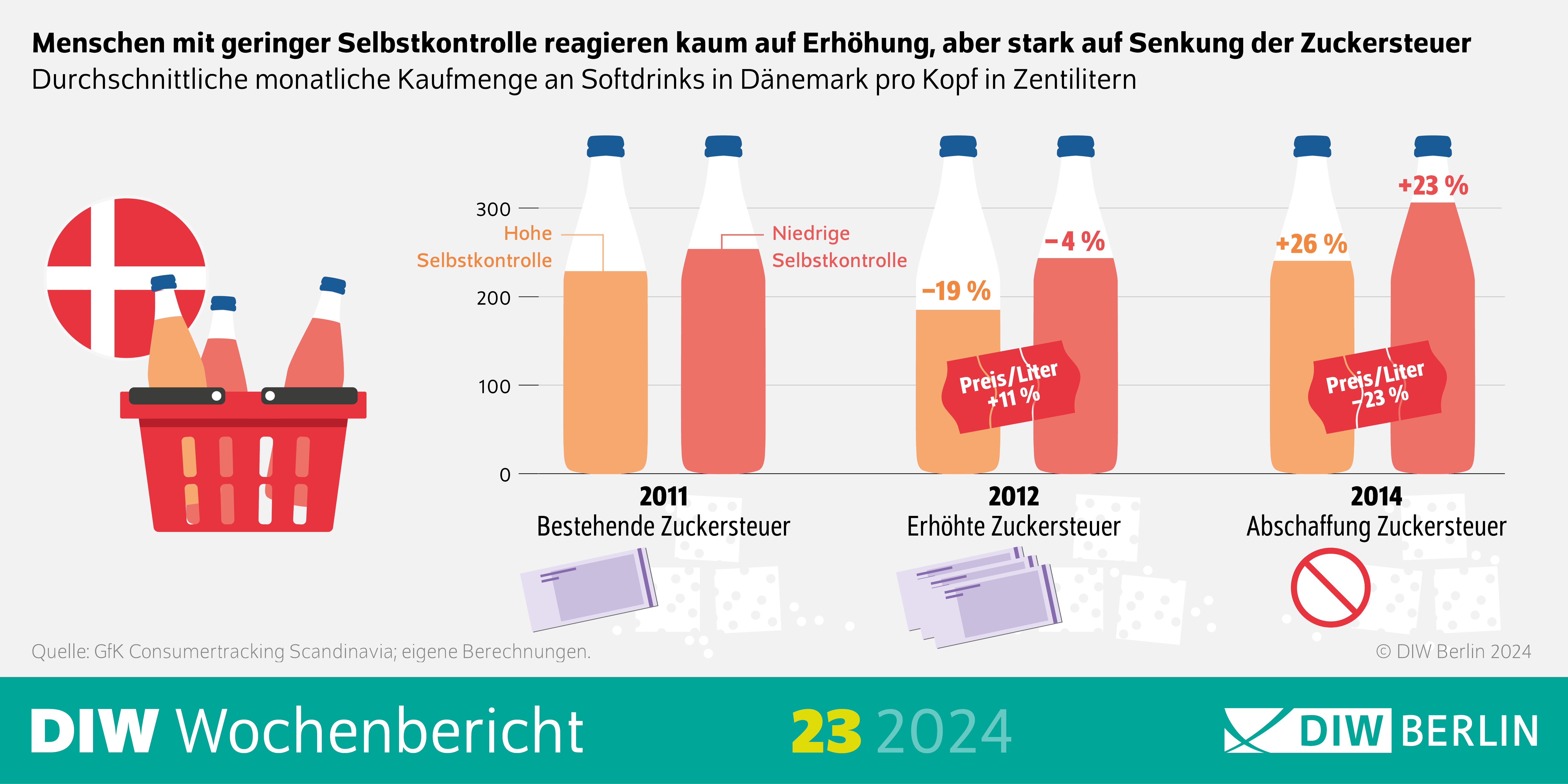 Um die Folgen eines zu hohen Zuckerkonsums – sowohl für einzelne Personen als auch für die Allgemeinheit – abzumildern, wird auch in Deutschland immer wieder die Einführung einer Zuckersteuer diskutiert. In Dänemark gab es zwischenzeitlich eine solche Steuer auf zuckerhaltige Getränke. Wie eine aktuelle Studie aus der Abteilung Staat des Deutschen Instituts für Wirtschaftsforschung (DIW Berlin) zeigt, waren die Erfahrungen mit der dänischen Steuer jedoch gemischt. Als die Steuer im Jahr 2012 stark erhöht wurde, tranken die Dän*innen im Durchschnitt zwar deutlich weniger zuckerhaltige Getränke. Allerdings reduzierten die Personen, die ihren Zuckerkonsum wenig unter Kontrolle haben, ihren Softdrink-Konsum trotz um elf Prozent höherer Preise im Vergleich zu Menschen mit hoher Selbstkontrolle kaum (nur um vier Prozent im Vergleich zu 19 Prozent). Als die dänische Regierung die Steuer im Jahr 2014 komplett abschaffte (woraufhin die Preise um 23 Prozent sanken), kauften beide Gruppen etwa ein Viertel mehr Softdrinks im Vergleich zu der Zeit, als die hohe Zuckersteuer Bestand hatte.