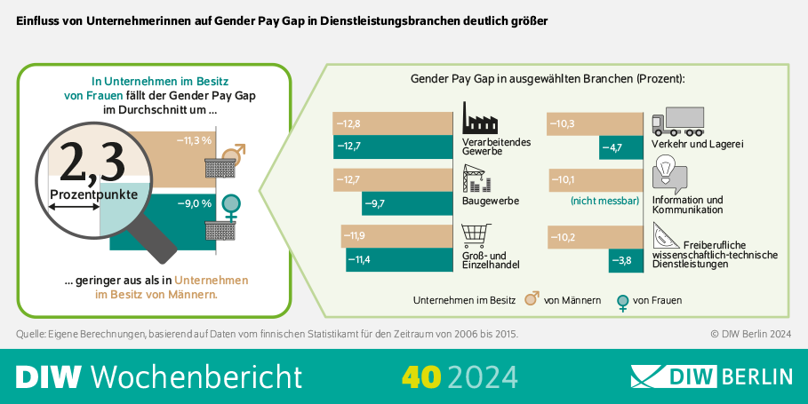 In Unternehmen im Eigentum von Frauen ist der Verdienstunterschied zwischen weiblichen und männlichen Beschäftigten geringer – in Unternehmen in vielen Bereichen der Dienstleistungsbranche ist dieser Verdienstunterschied sogar nahe Null. Dies ist das Ergebnis einer aktuellen Studie des Deutschen Instituts für Wirtschaftsforschung (DIW Berlin). Erstmalig wurde der Zusammenhang zwischen dem Geschlecht von Unternehmer*innen und den Löhnen untersucht, die den weiblichen Beschäftigten im Vergleich zu ihren männlichen Kollegen gezahlt werden. Im Durchschnitt ist die Lohnlücke in Unternehmen im Besitz von Frauen mehr als zwei Prozentpunkte niedriger als in Unternehmen von Männern. Dabei gibt es erhebliche Branchenunterschiede, hat Studienautor Alexander S. Kritikos, Vorstandsmitglied des DIW Berlin, festgestellt: „Im Dienstleistungsbereich sind die Verdienstabstände deutlich geringer, wenn Unternehmen im Eigentum von Frauen sind. In diesen häufig eher kleineren Unternehmen lassen es die Managementstrukturen zu, dass Unternehmerinnen die Löhne in ihren Betrieben ausgestalten.“